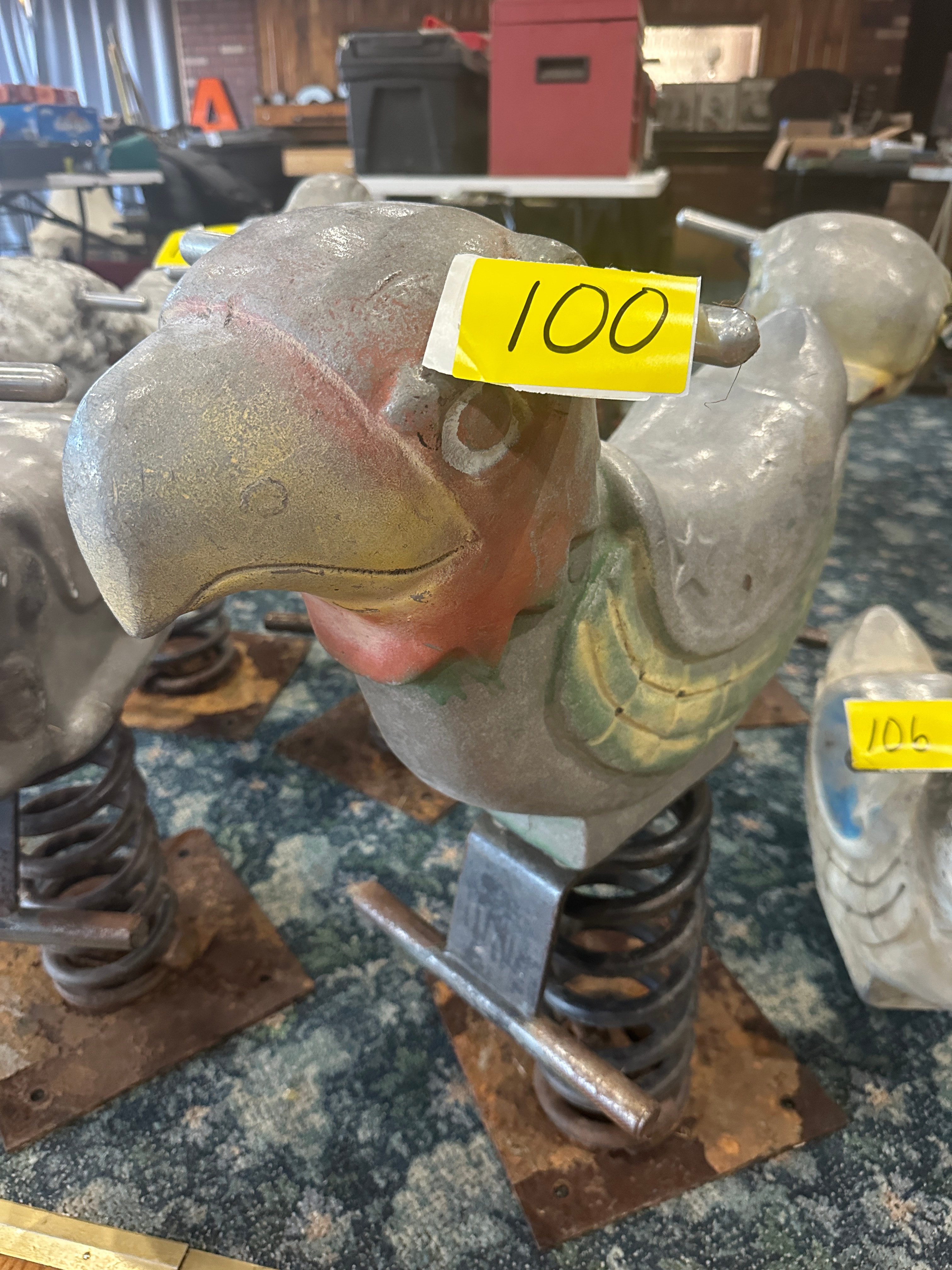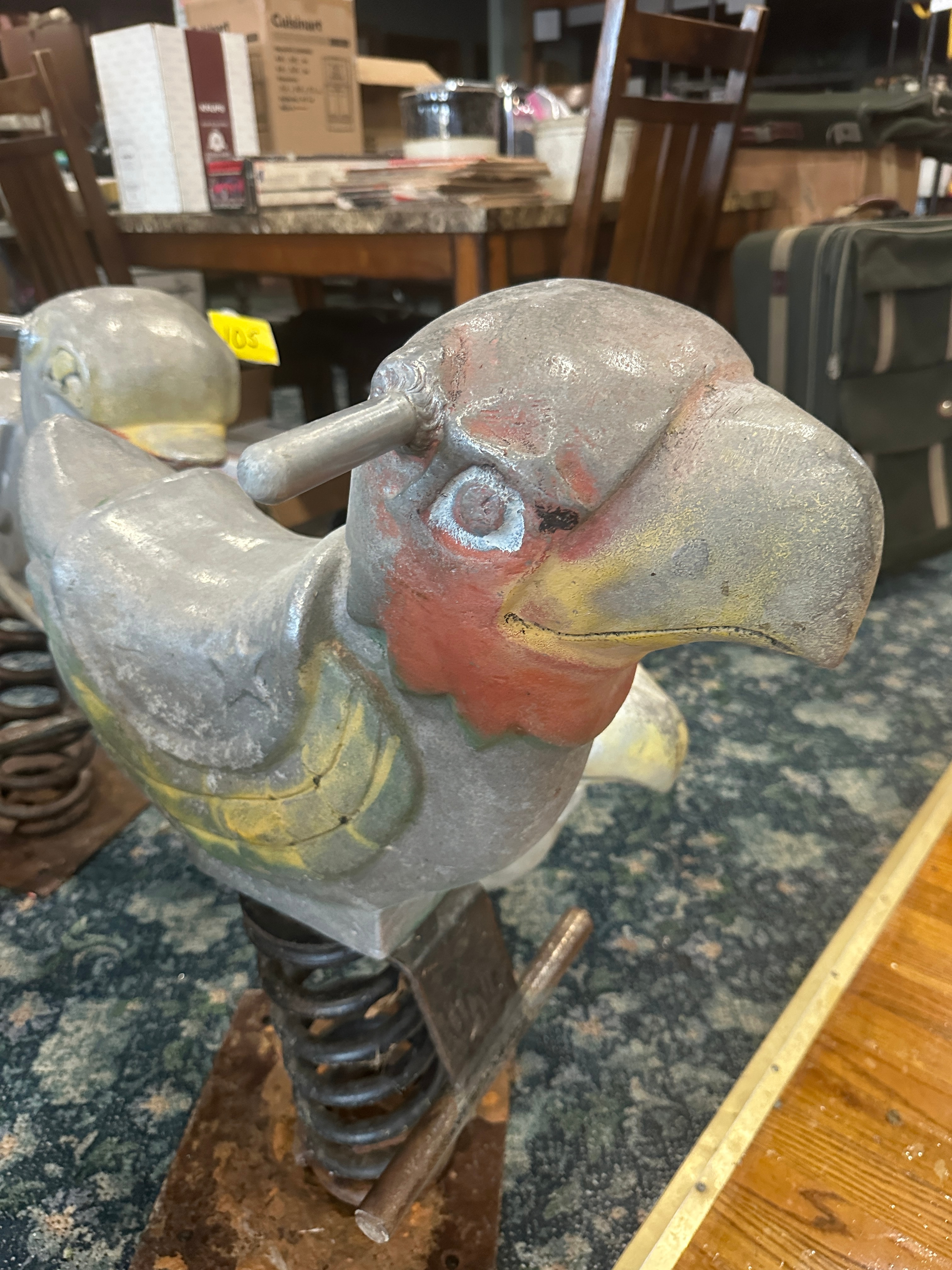 A vintage Kidstuff Playsystems Fun-A-Mal cast aluminum spring rider, sculpted in the form of a parrot or other bird. Originally painted predominantly grey with accents of red on the neck, and yellow and green on the wings. It features metal handlebars protruding from the head and is mounted on a large, heavy-gauge metal spring attached to a rectangular metal base plate. This item was formerly located at the Mountain View School District in Kingsley, PA.