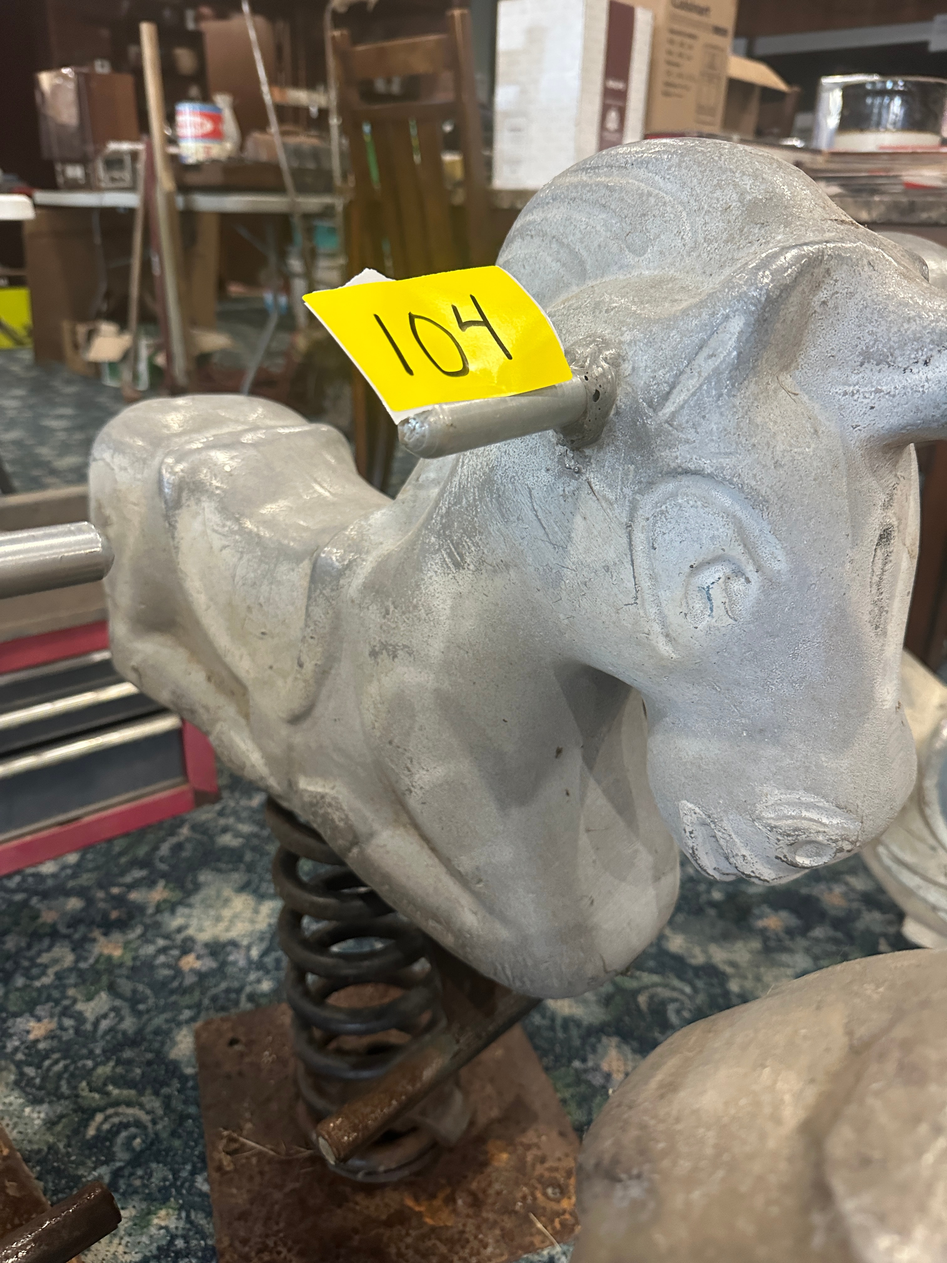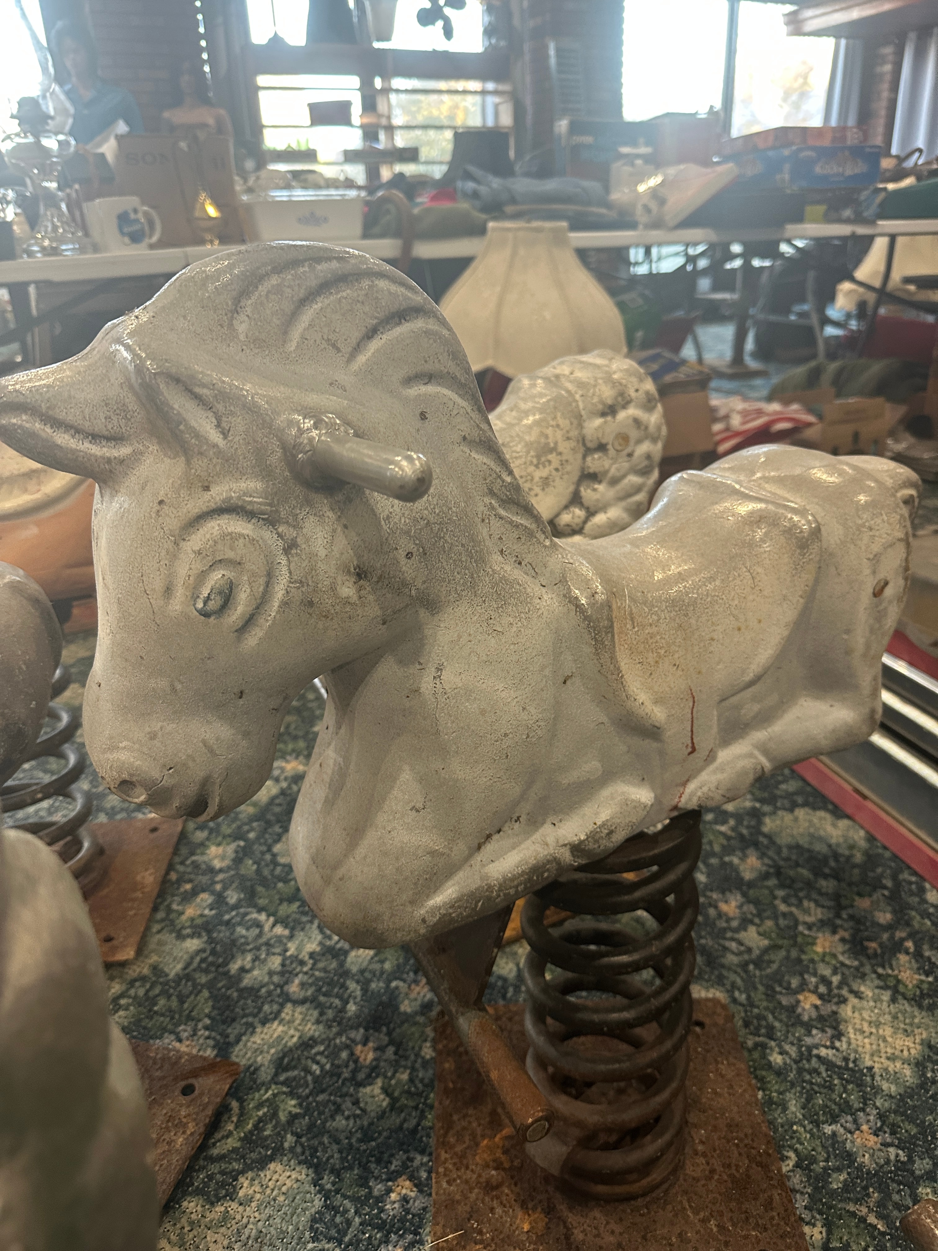 A vintage spring-mounted playground rider, shaped as a stylized horse, constructed from cast aluminum. The grey body is affixed to a large metal coil spring, which is then mounted on a metal base. This item originates from the Mountain View School District in Kingsley, PA.