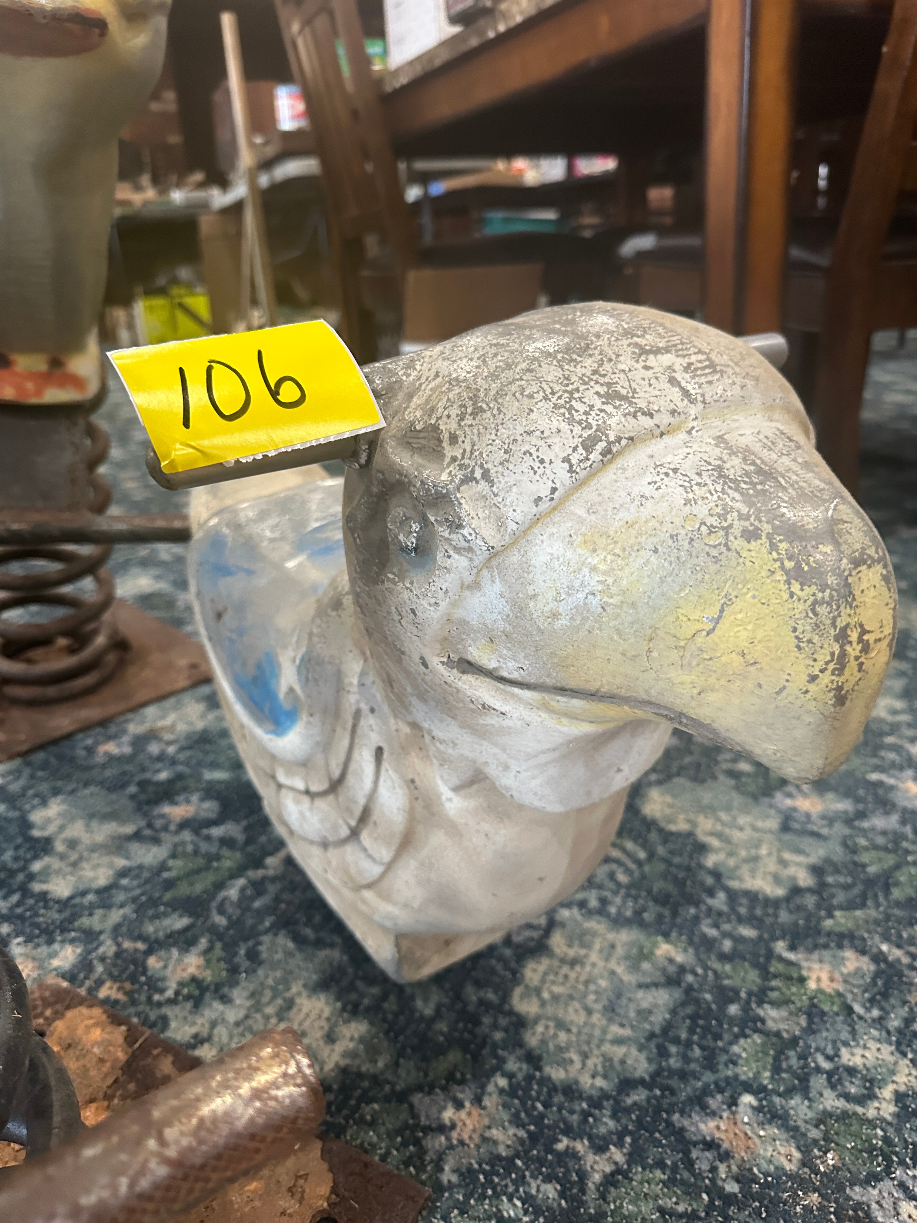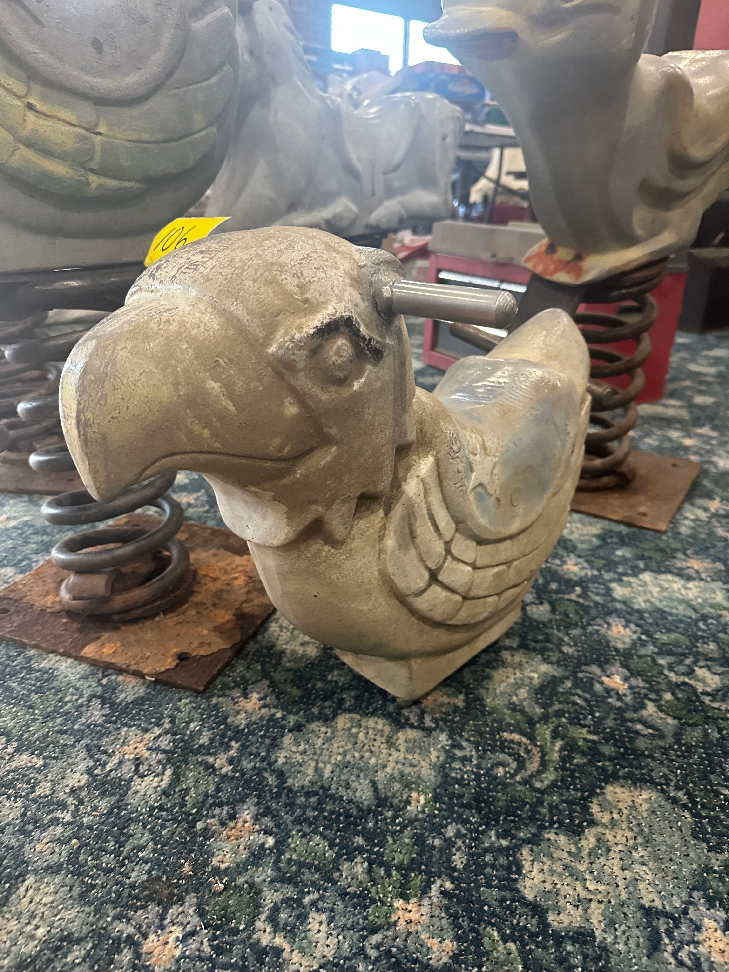 This vintage-style ride-on playground toy depicts a stylized parrot or bird of prey. The body is constructed from cast aluminum and is missing the original spring and metal base. The item retains a heavily faded and chipped painted finish, showing tones of off-white, grey, and traces of yellow and blue. This item originates from the Mountain View School District in Kingsley, PA.