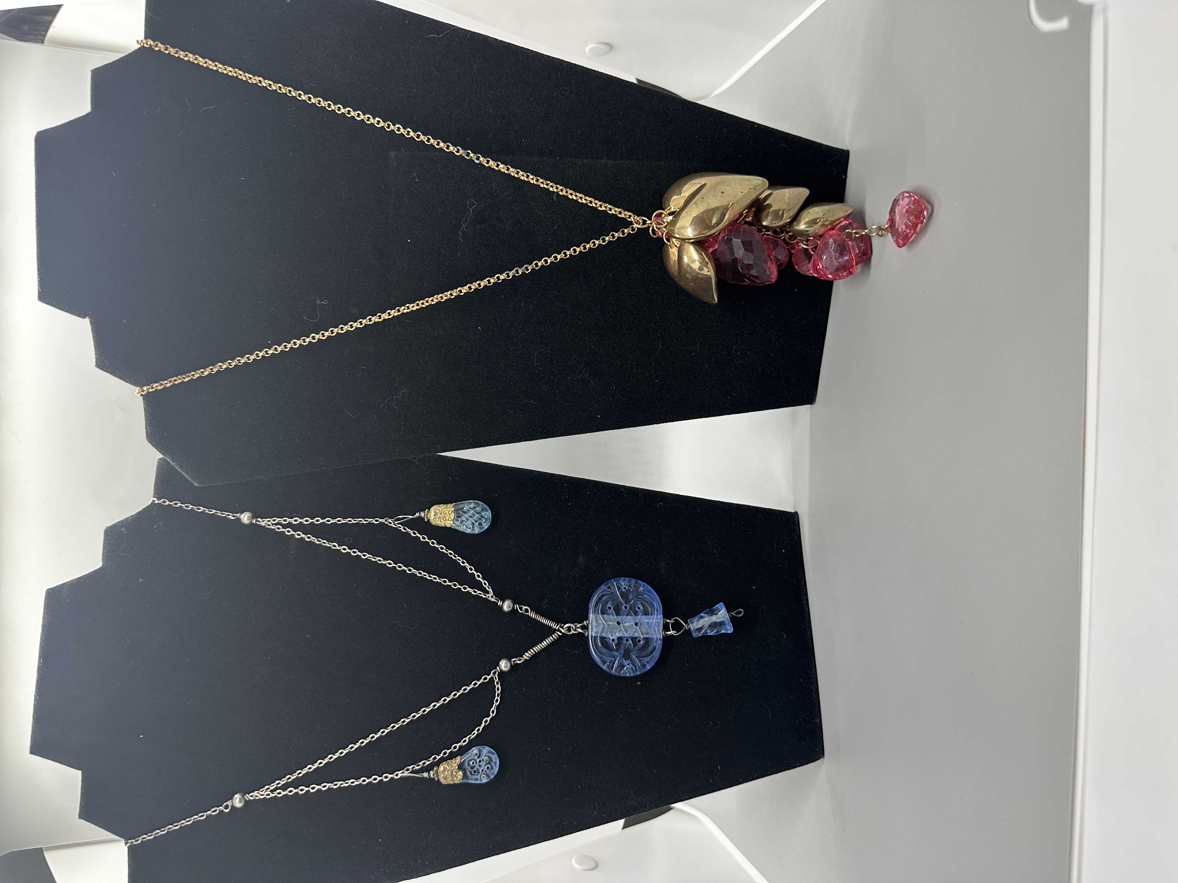 Two necklaces including a gold-toned piece with pink heart-shaped beads and leaf accents and a silver-toned piece with carved blue glass beads.