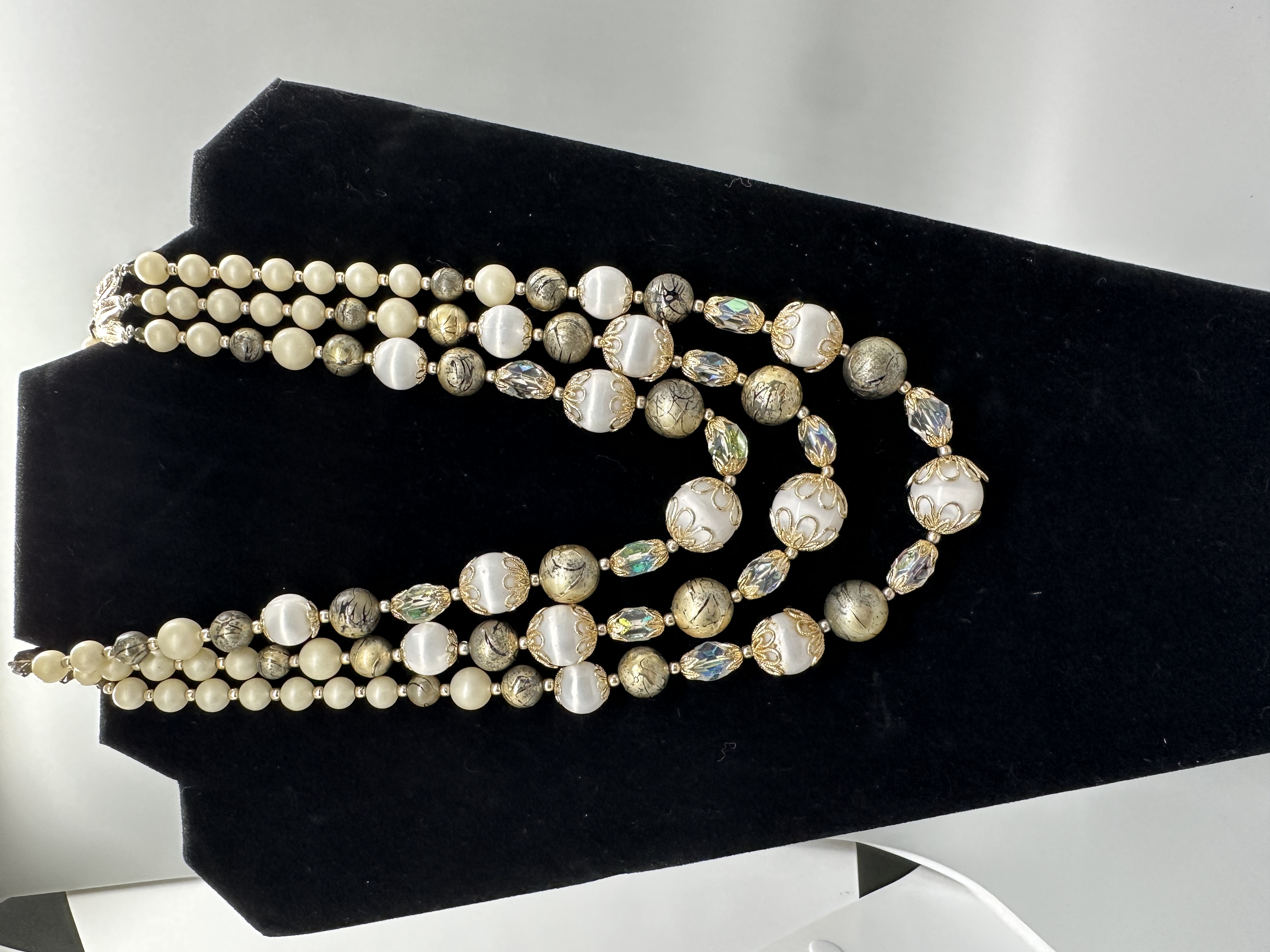 A three-strand beaded necklace featuring white, cream, and gold-tone beads in smooth, iridescent faceted, and mottled metallic finishes accented with gold-tone filigree caps.
