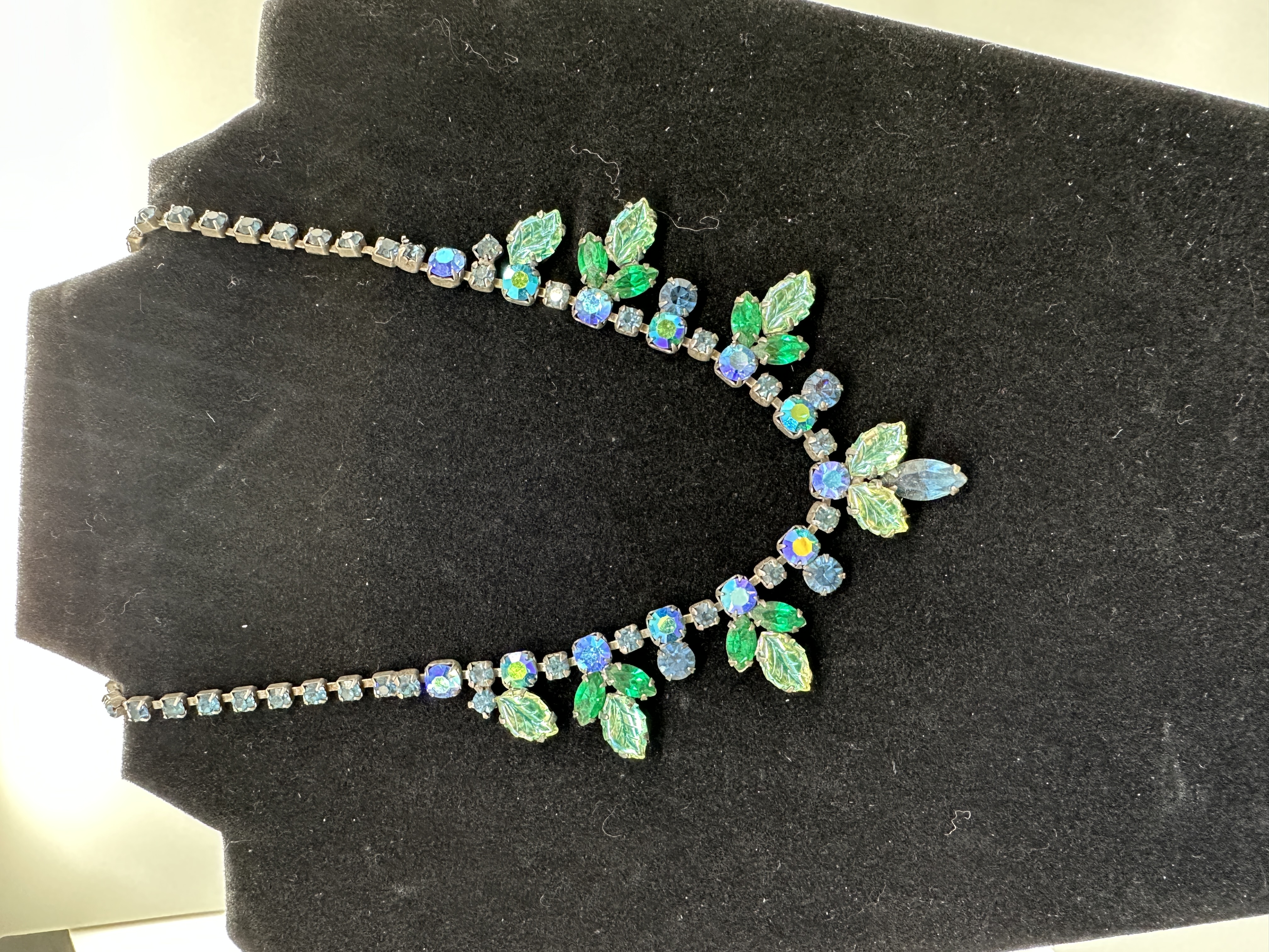 A vintage-style costume jewelry necklace featuring blue and green faceted rhinestones and molded glass leaf elements set on a silver-tone chain.