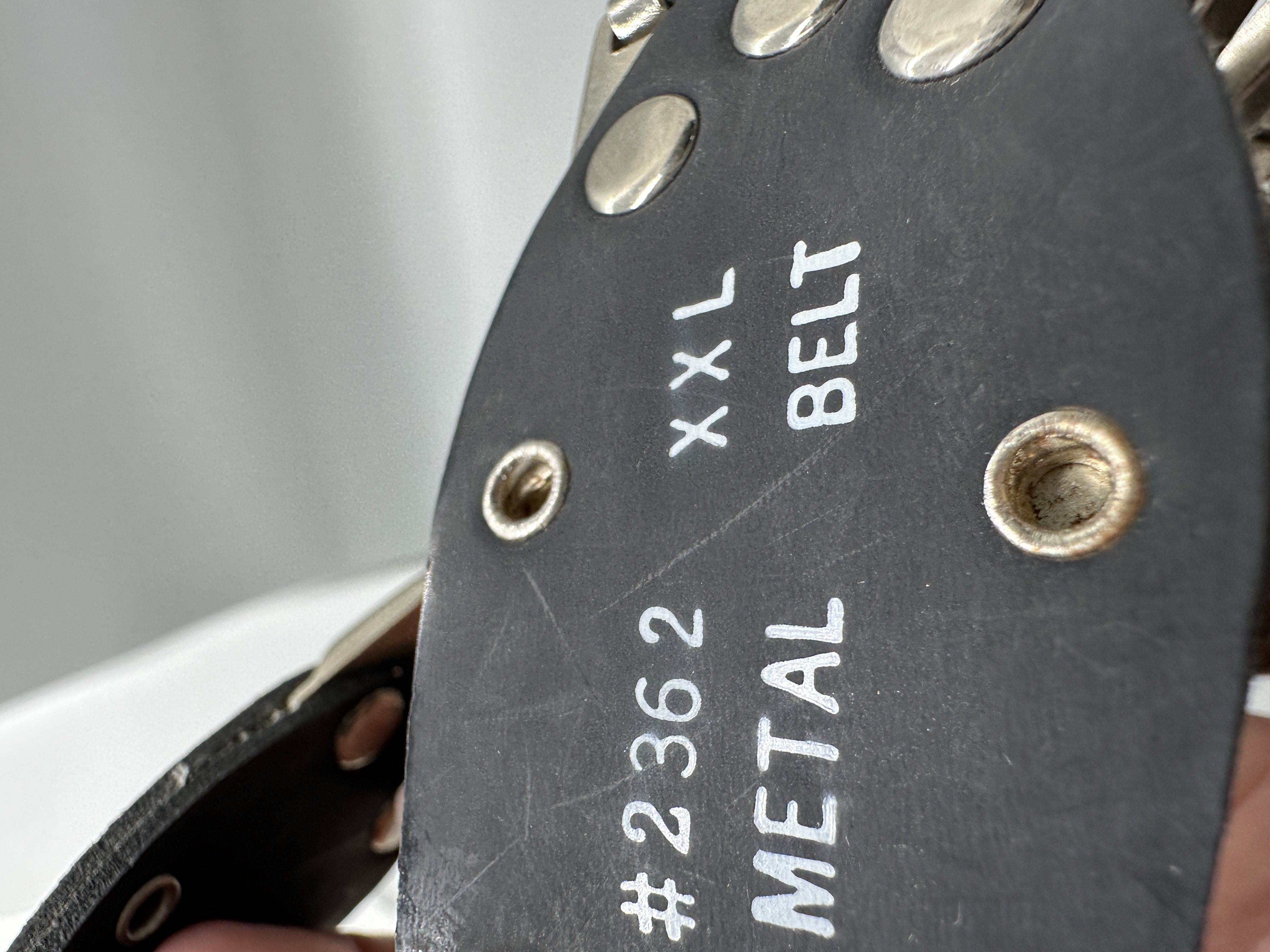 A silver-toned metal belt featuring linked rectangular plates embossed with BAD GIRL and a black adjustable strap marked XXL.