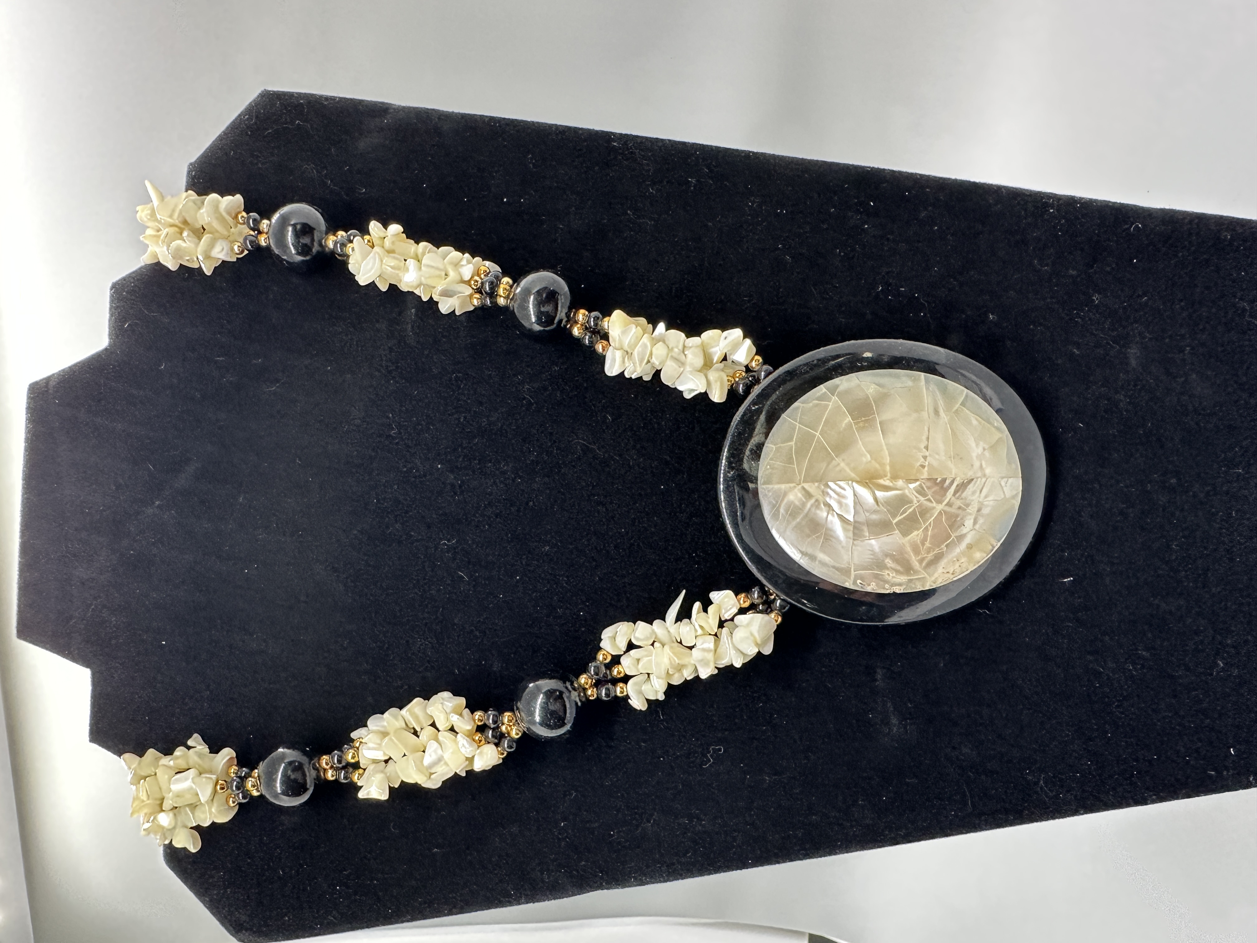 A necklace featuring creamy white shell-chip clusters, round black beads, and gold-tone spacers with a large oval black pendant containing an iridescent shell inlay.