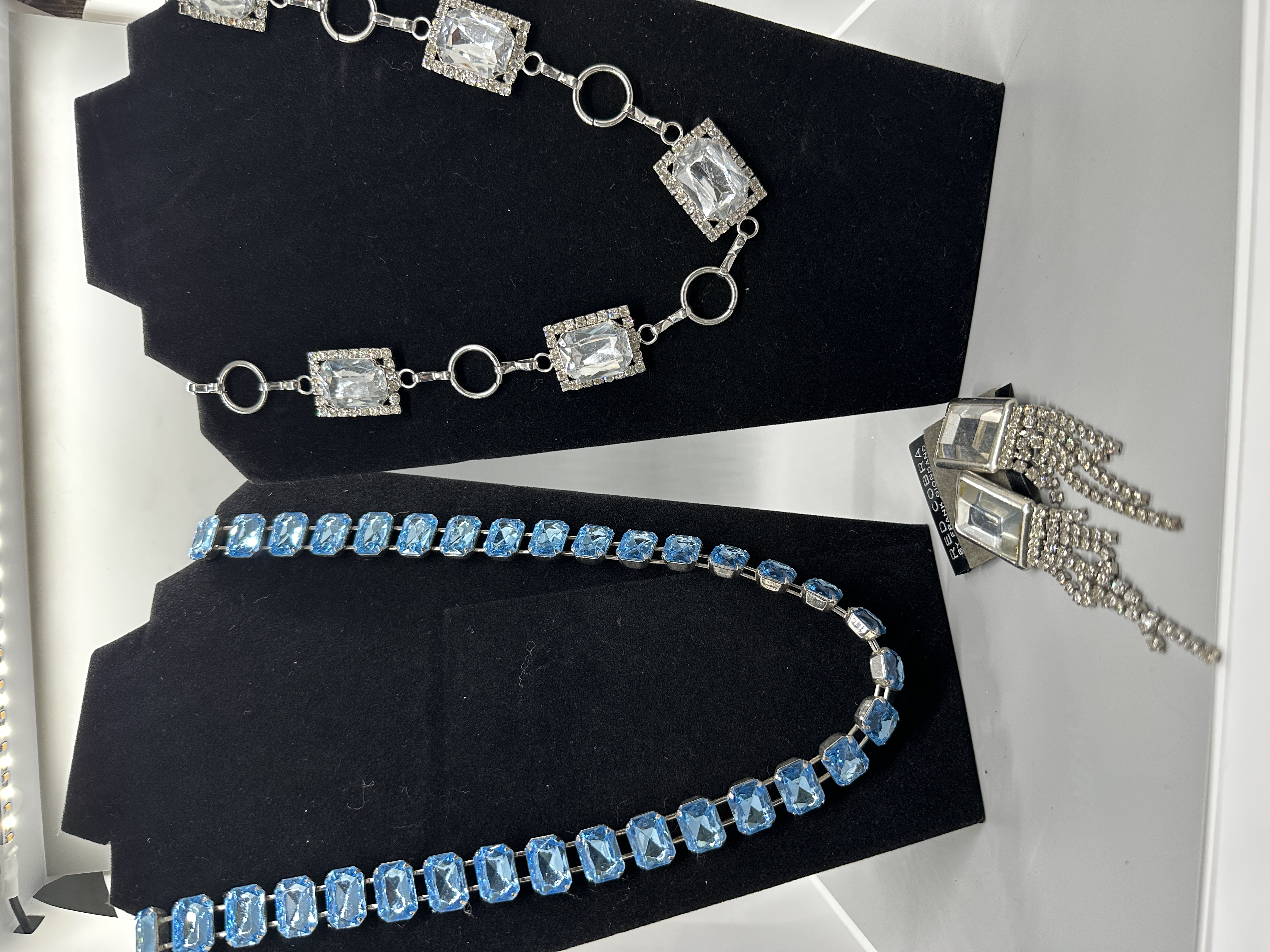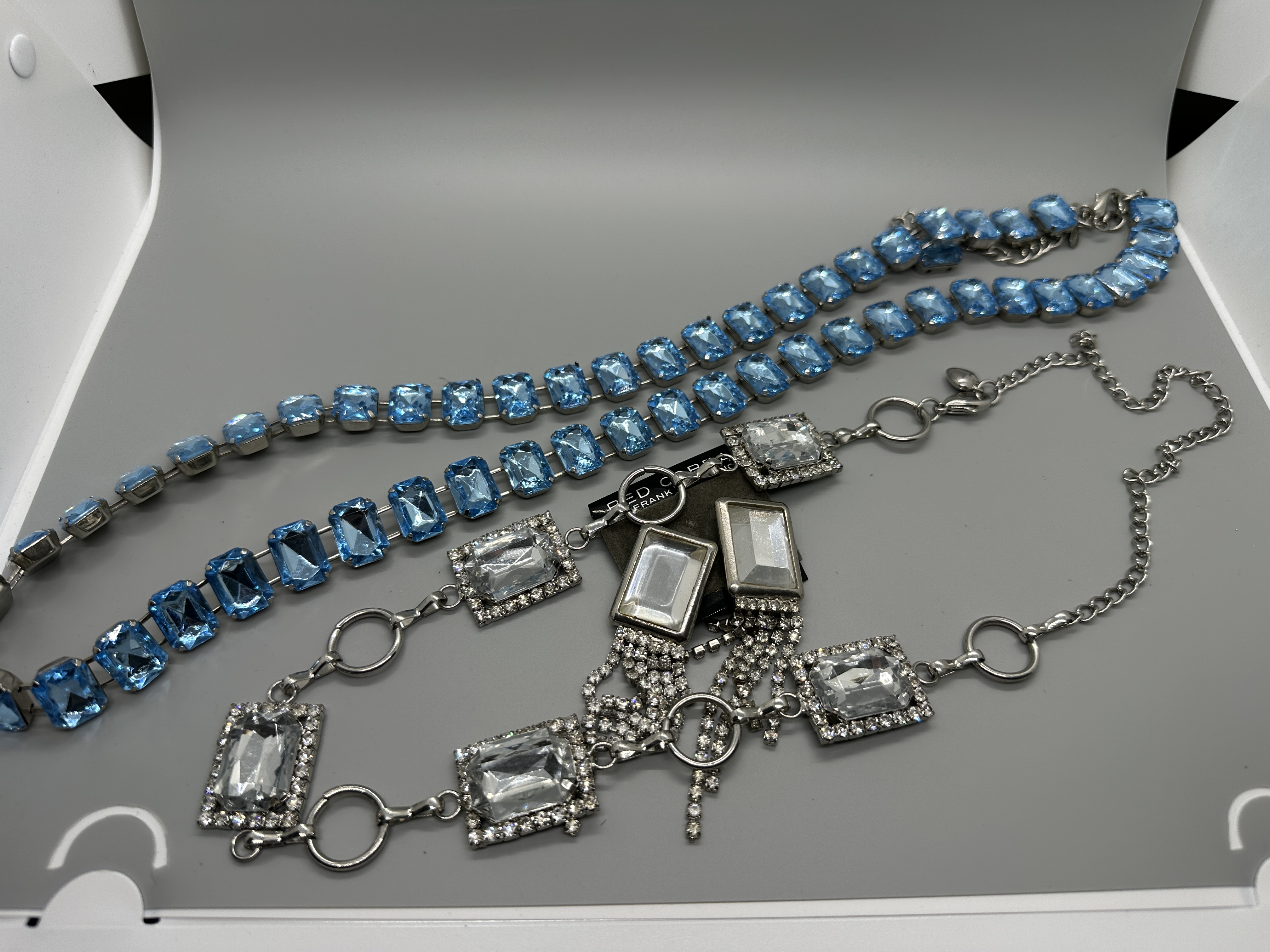 A collection featuring a light blue emerald-cut stone necklace, a silver-toned clear stone necklace, and a pair of fringe earrings labeled Red Cobra by Frank Giordano.