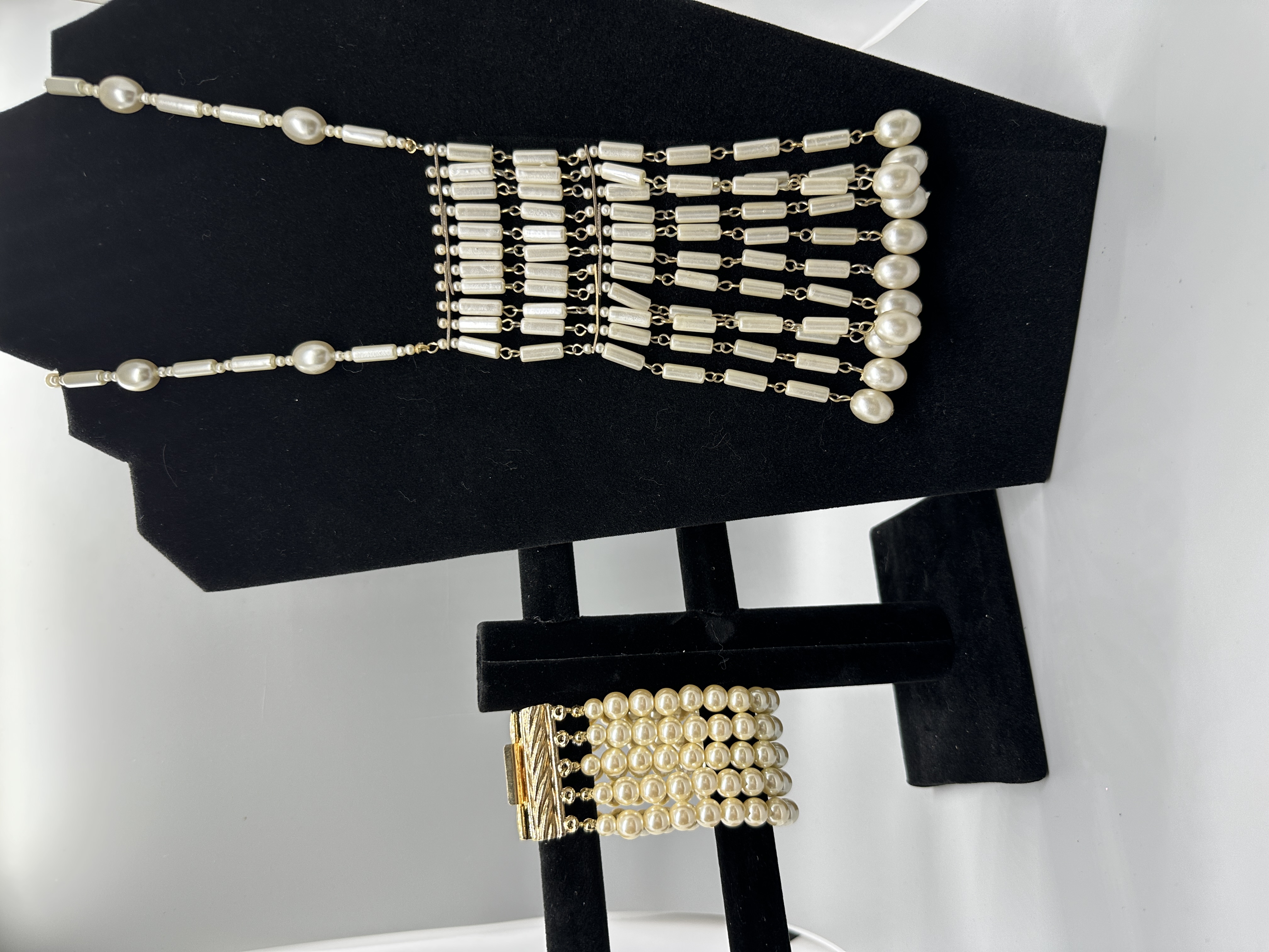 A cream-colored faux pearl multi-strand bib necklace and a coordinating wide bracelet with gold-toned accents.