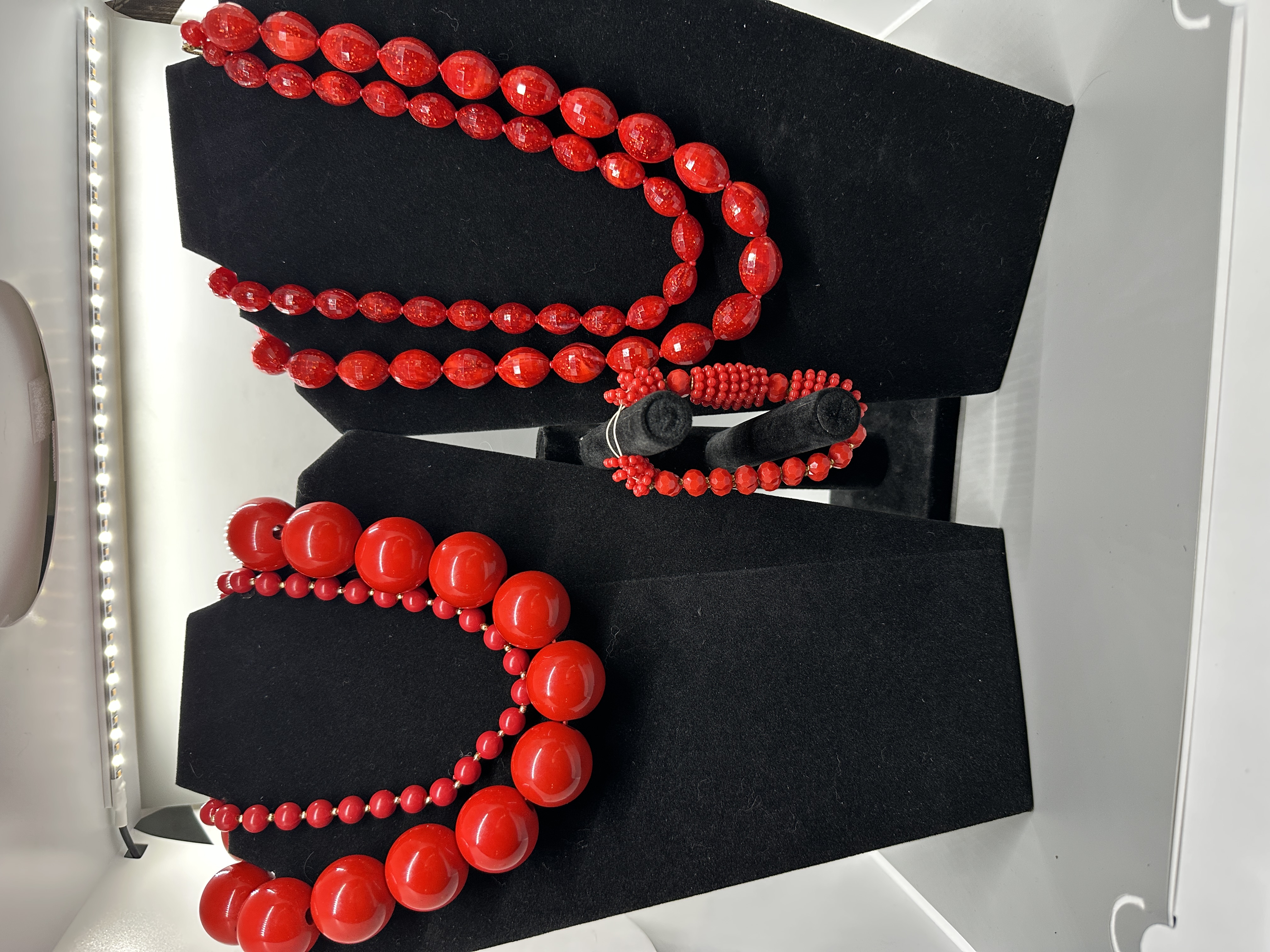 A collection of red beaded jewelry featuring several necklaces with smooth and faceted beads along with a matching beaded bracelet.