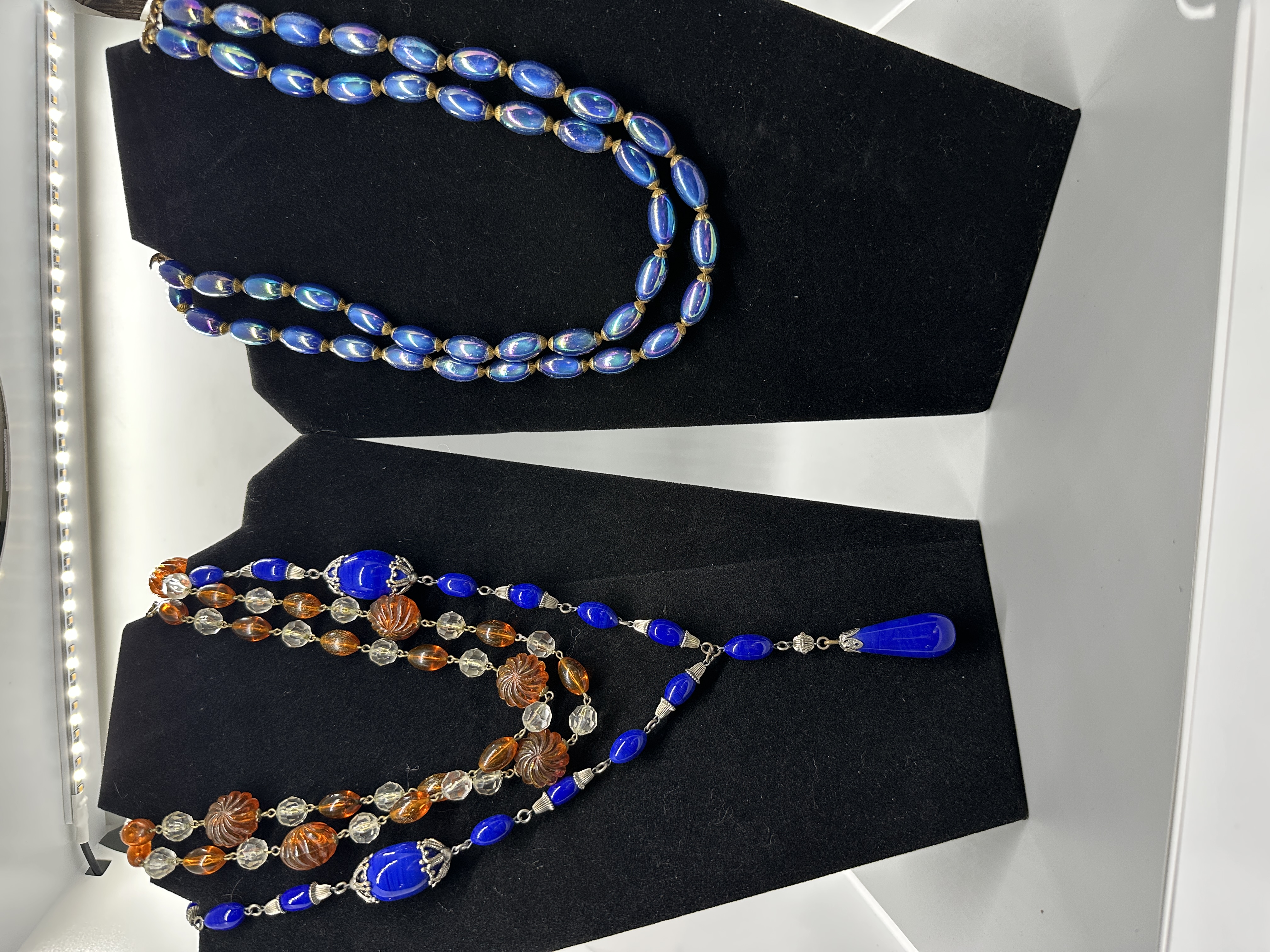 A collection of beaded necklaces featuring iridescent blue, cobalt blue, orange, and clear beads in various shapes and sizes.
