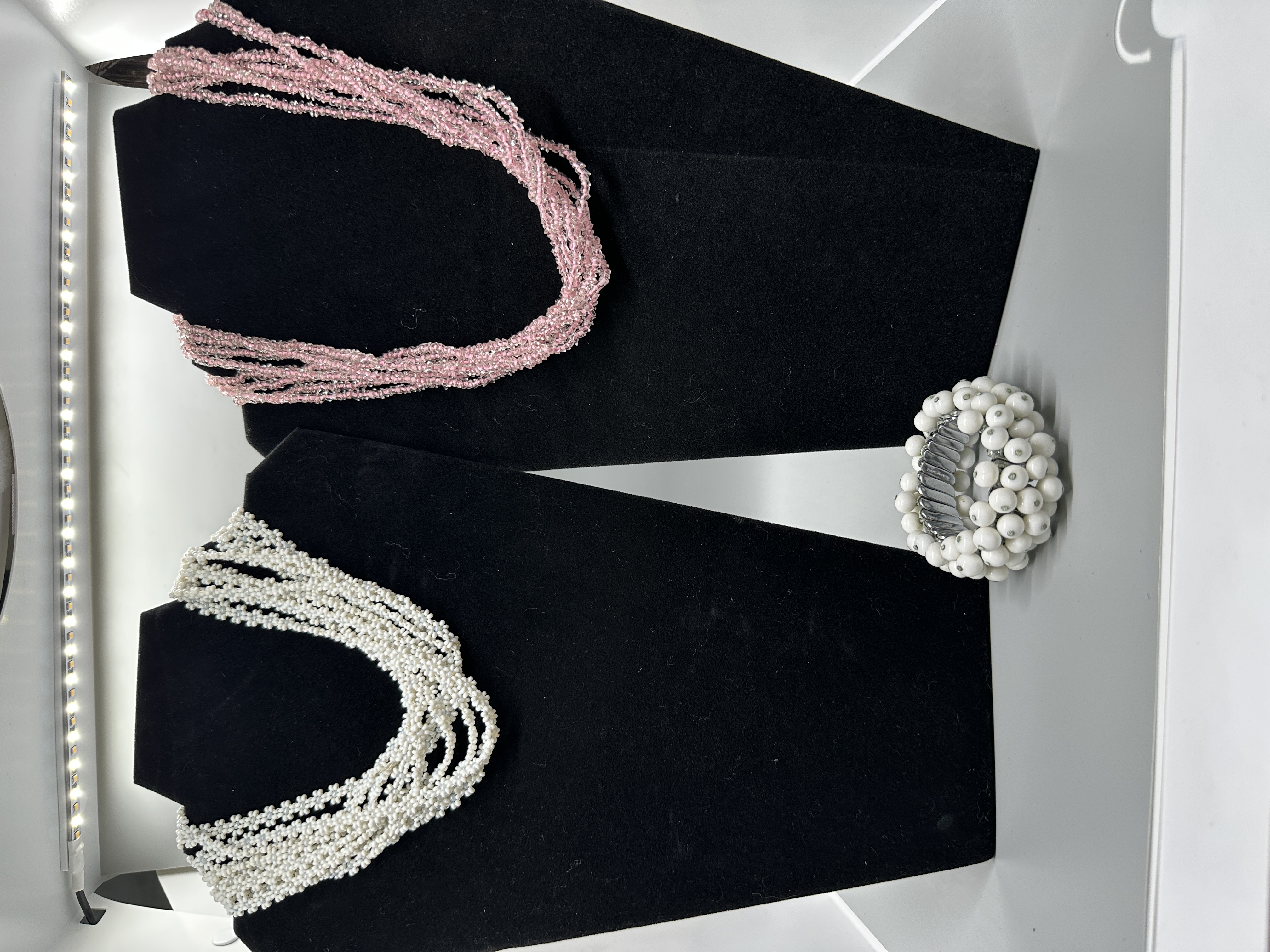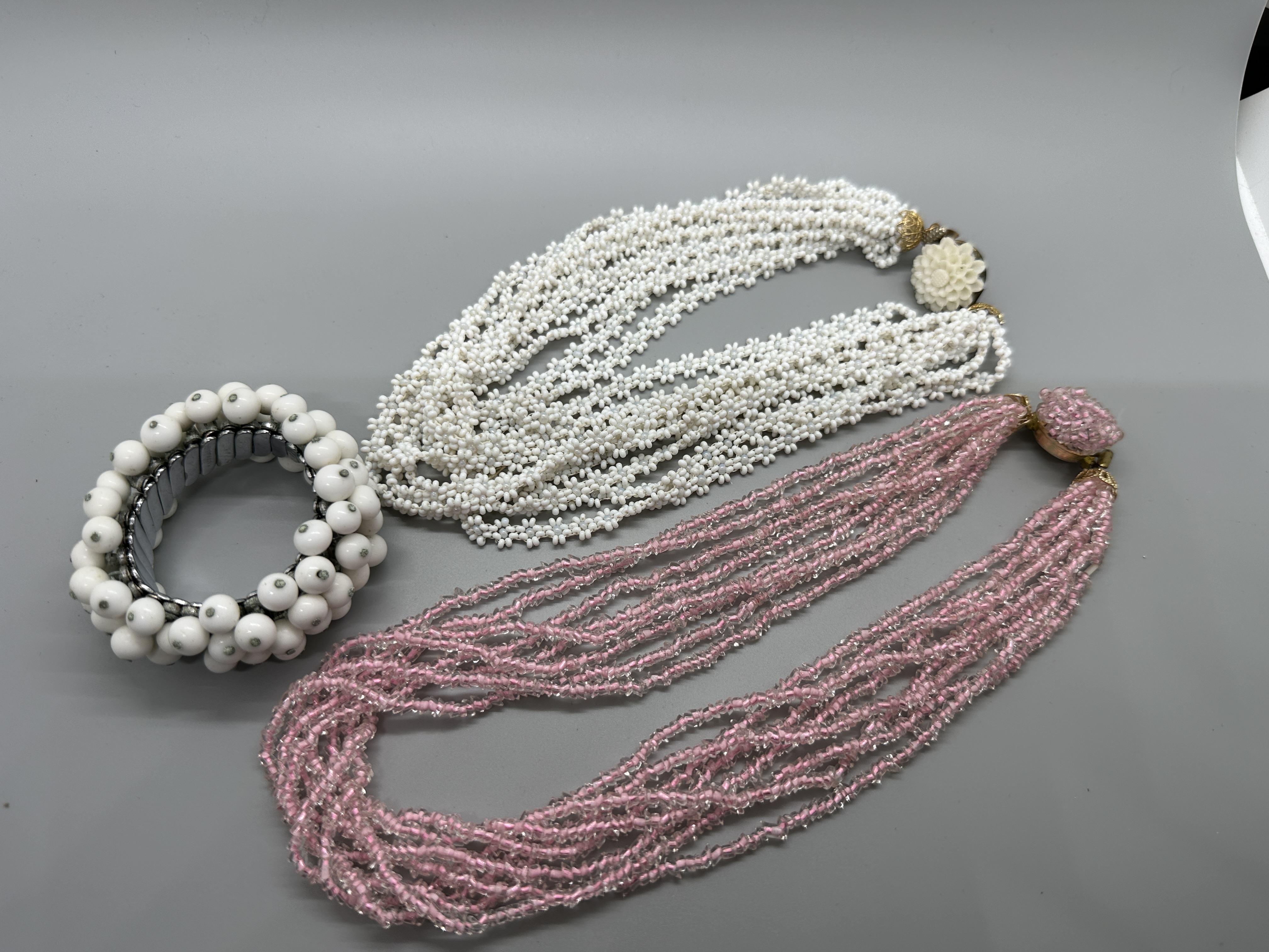 A trio of jewelry pieces including a multi-strand pink beaded necklace, a multi-strand white beaded necklace with a floral clasp, and a white beaded stretch bracelet.