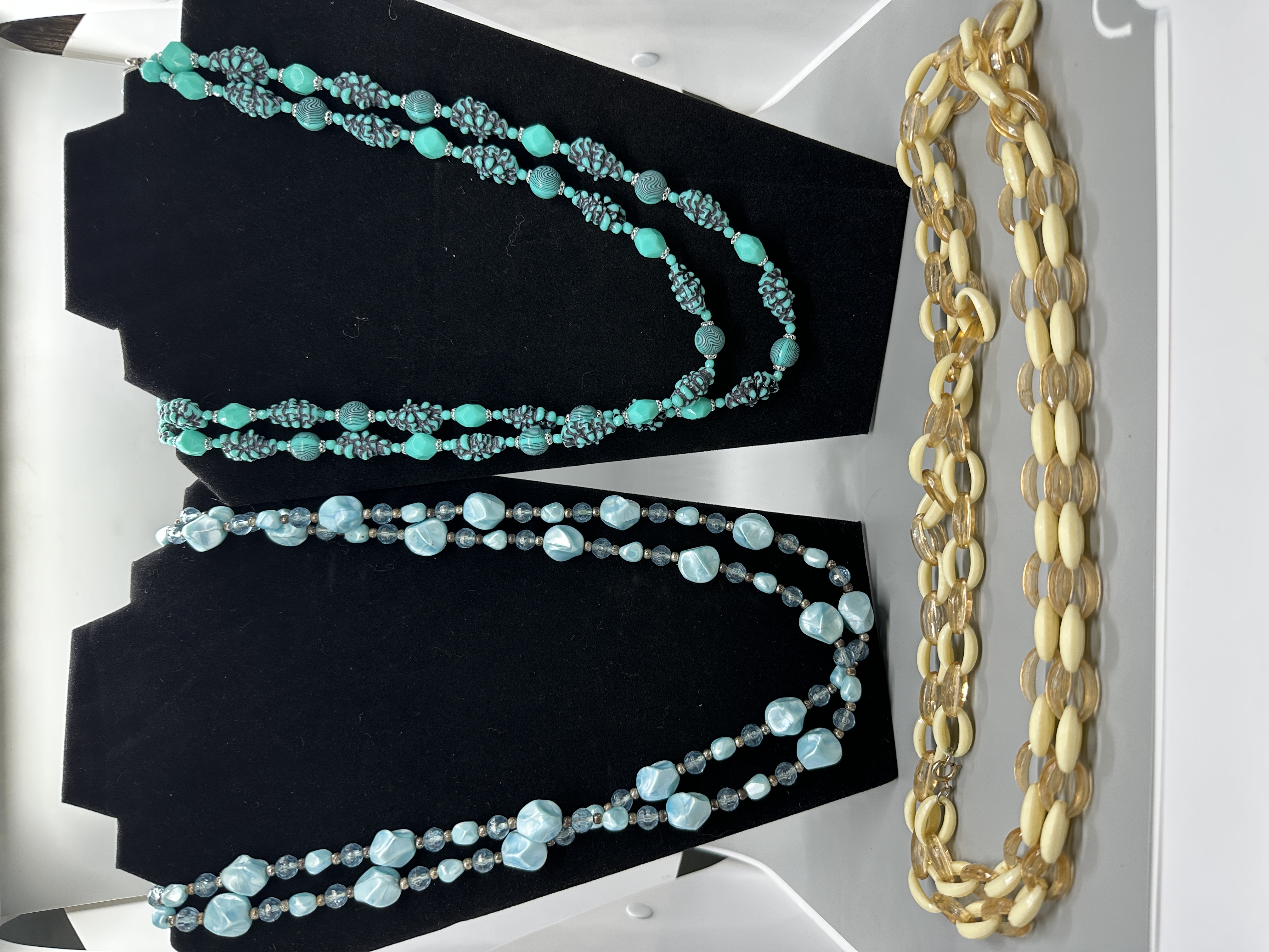 A collection of beaded and link necklaces in various colors including teal, light blue, cream, and amber.