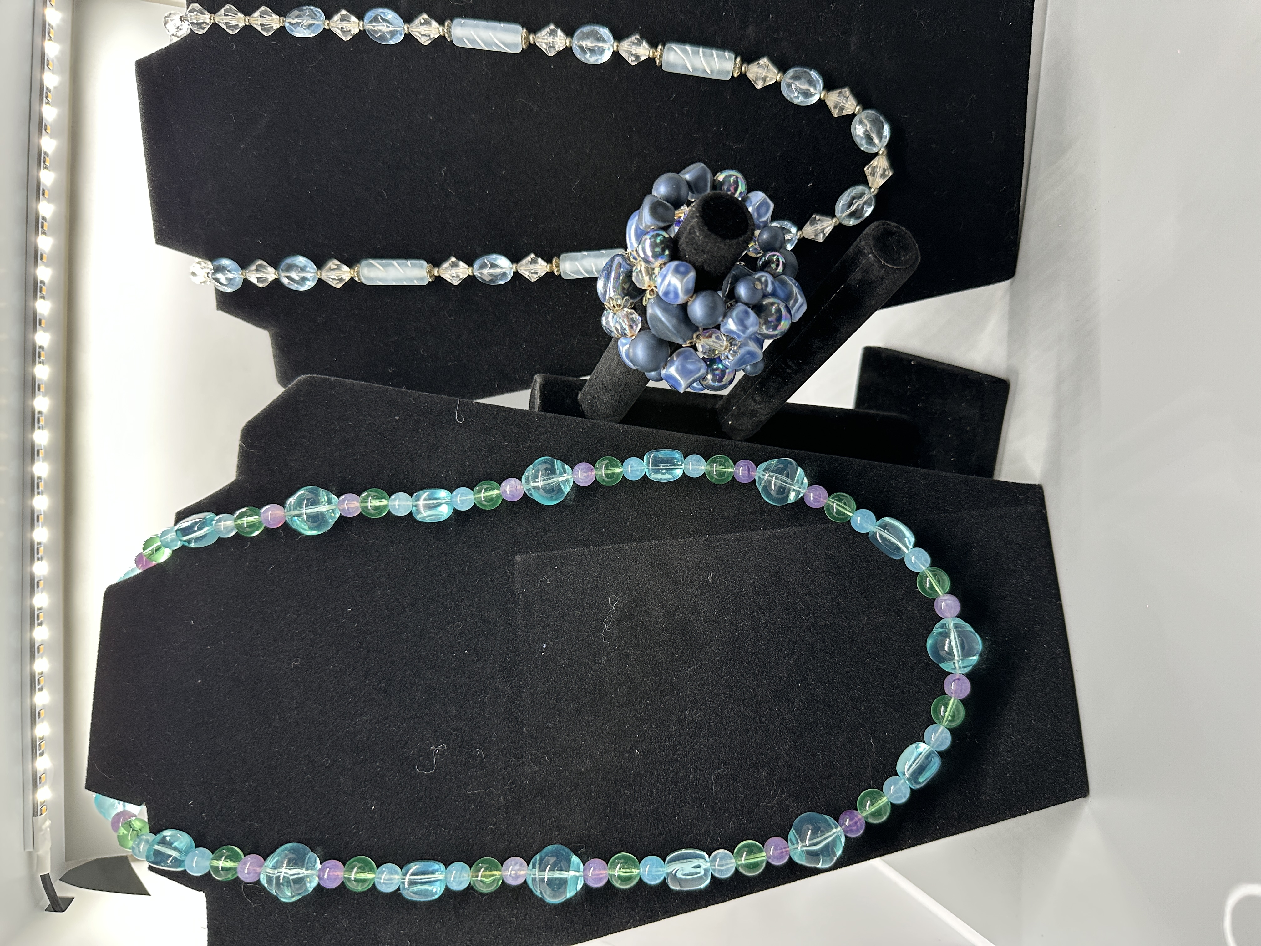 A trio of jewelry items including two beaded necklaces and one wrap bracelet in shades of blue, green, purple, and clear.