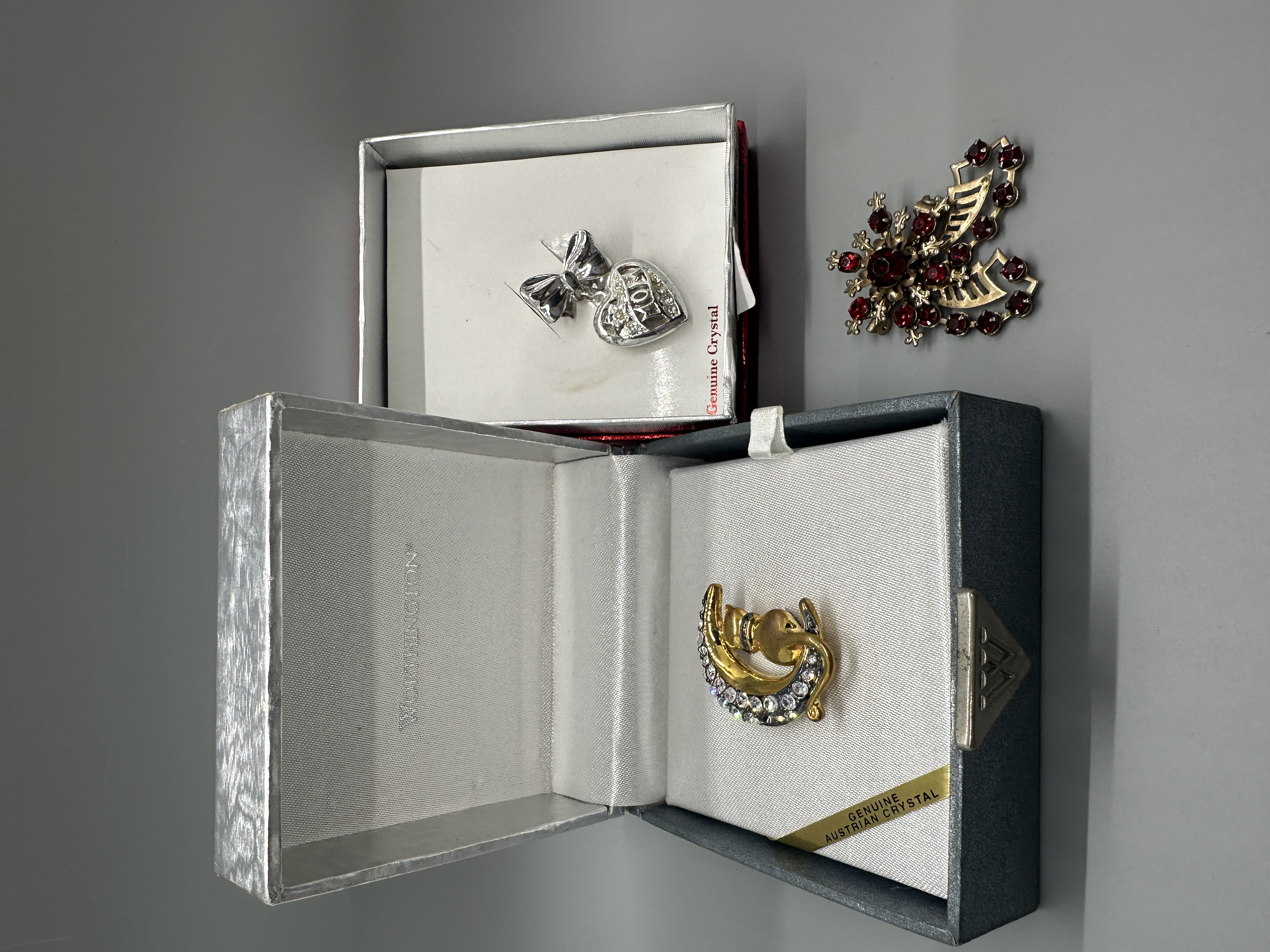 A trio of jewelry pieces including a silver-tone MOM heart pendant with crystals, a Northington gold-tone crescent brooch with Austrian crystals, and a gold-tone brooch set with red stones.