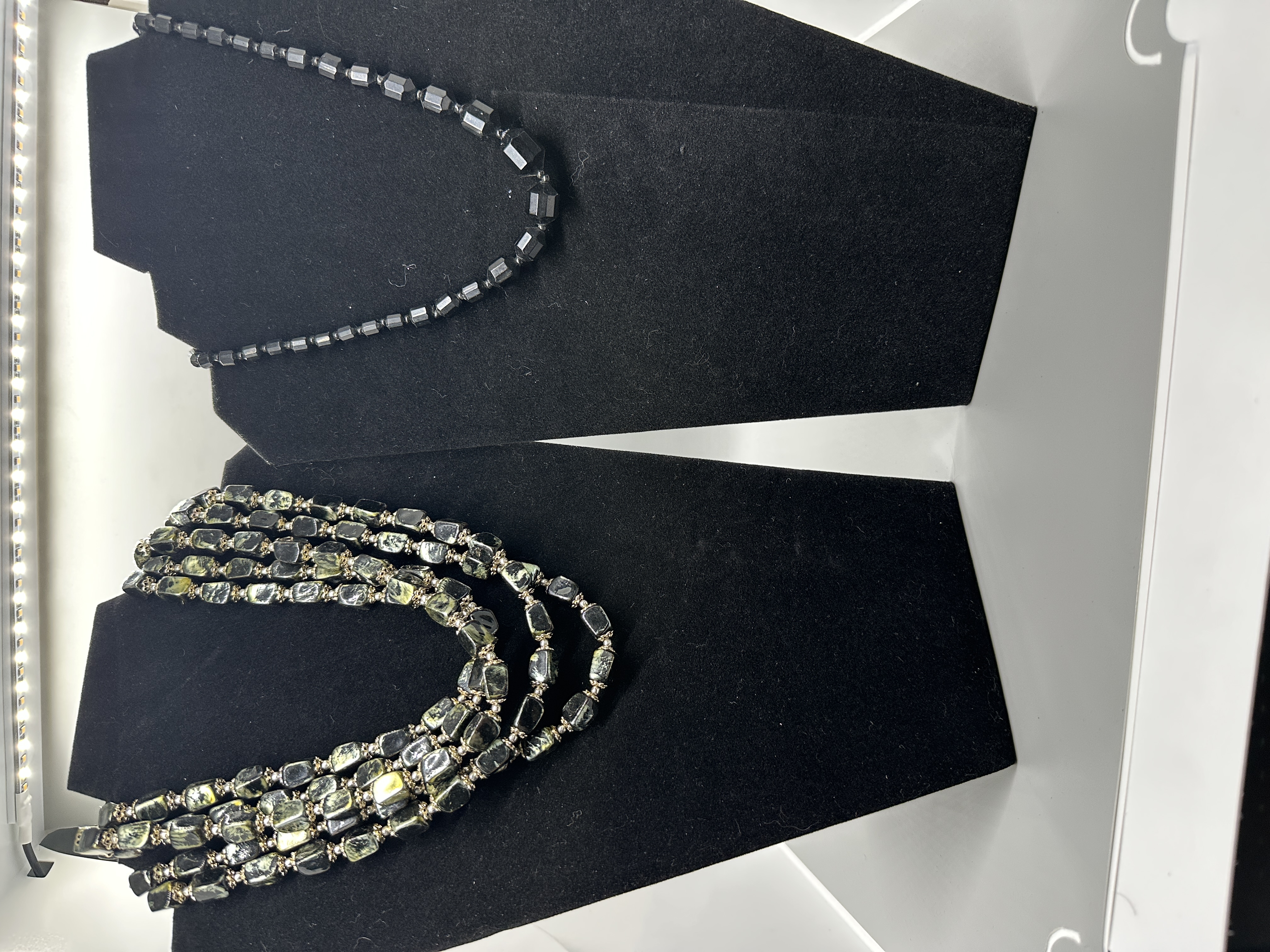 Two necklaces including a single-strand faceted black bead piece and a multi-strand necklace with green and black marbled rectangular beads.
