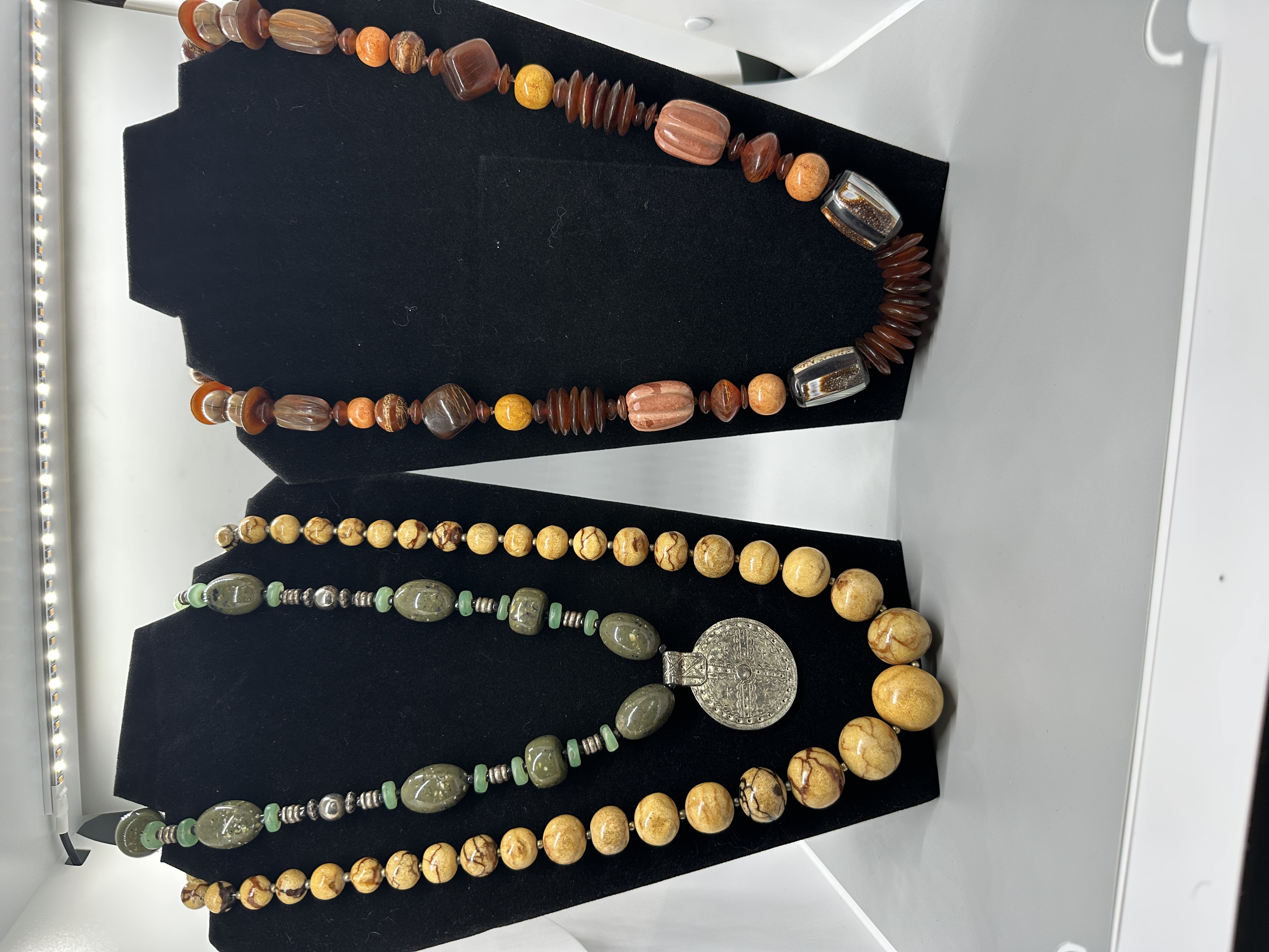 A trio of beaded necklaces featuring earthy tones of brown, orange, yellow, and green, including one piece with a large ornate silver-toned circular medallion pendant.