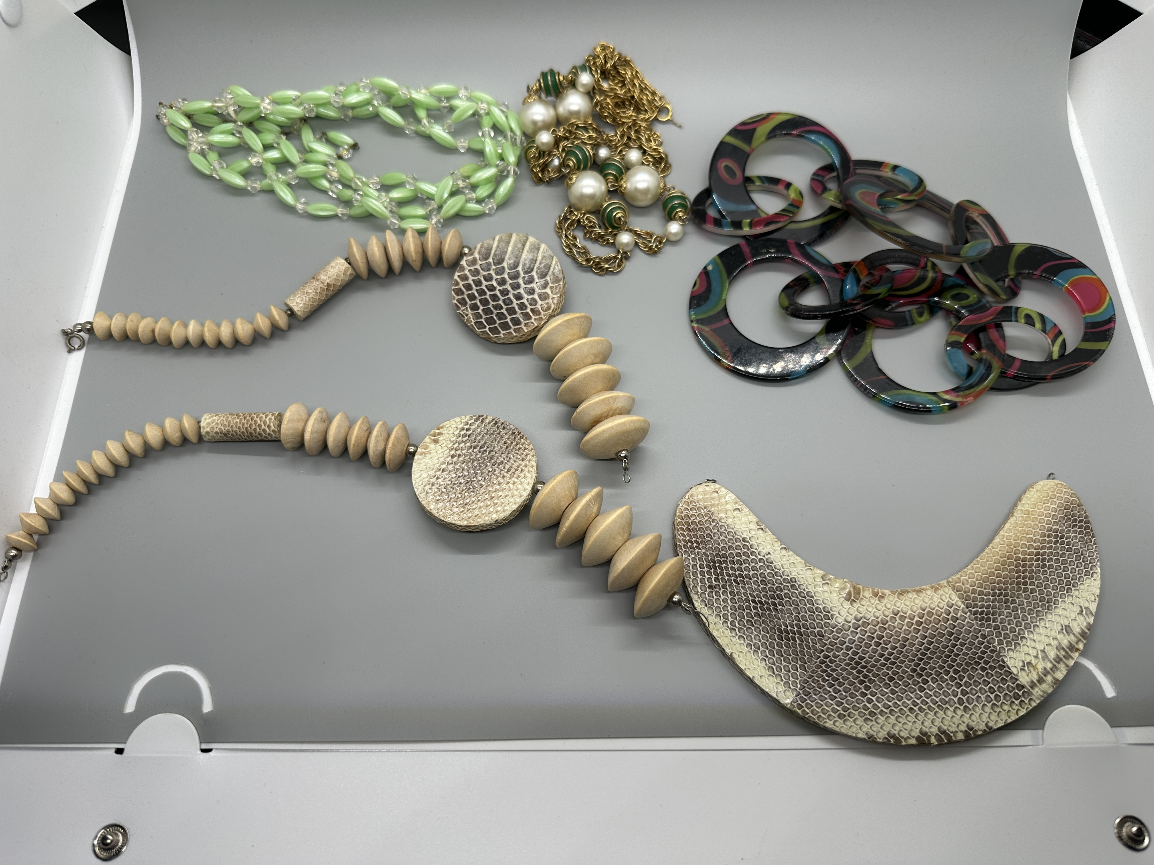 A collection of broken fashion necklaces featuring a light green beaded strand, a gold-tone chain with faux pearls, a multicolored linked-ring piece, and a large tan necklace with wooden beads and snakeskin-patterned accents.