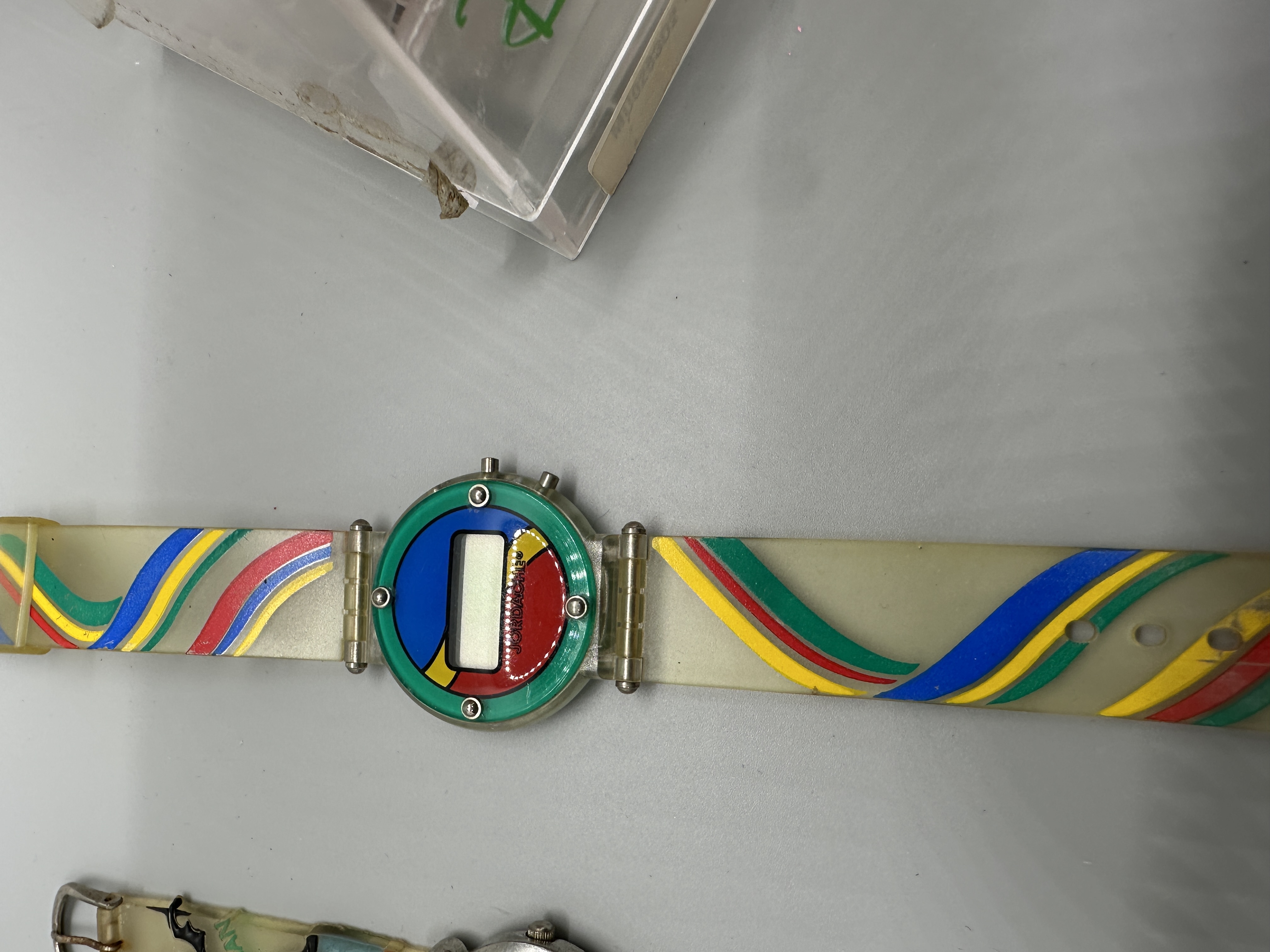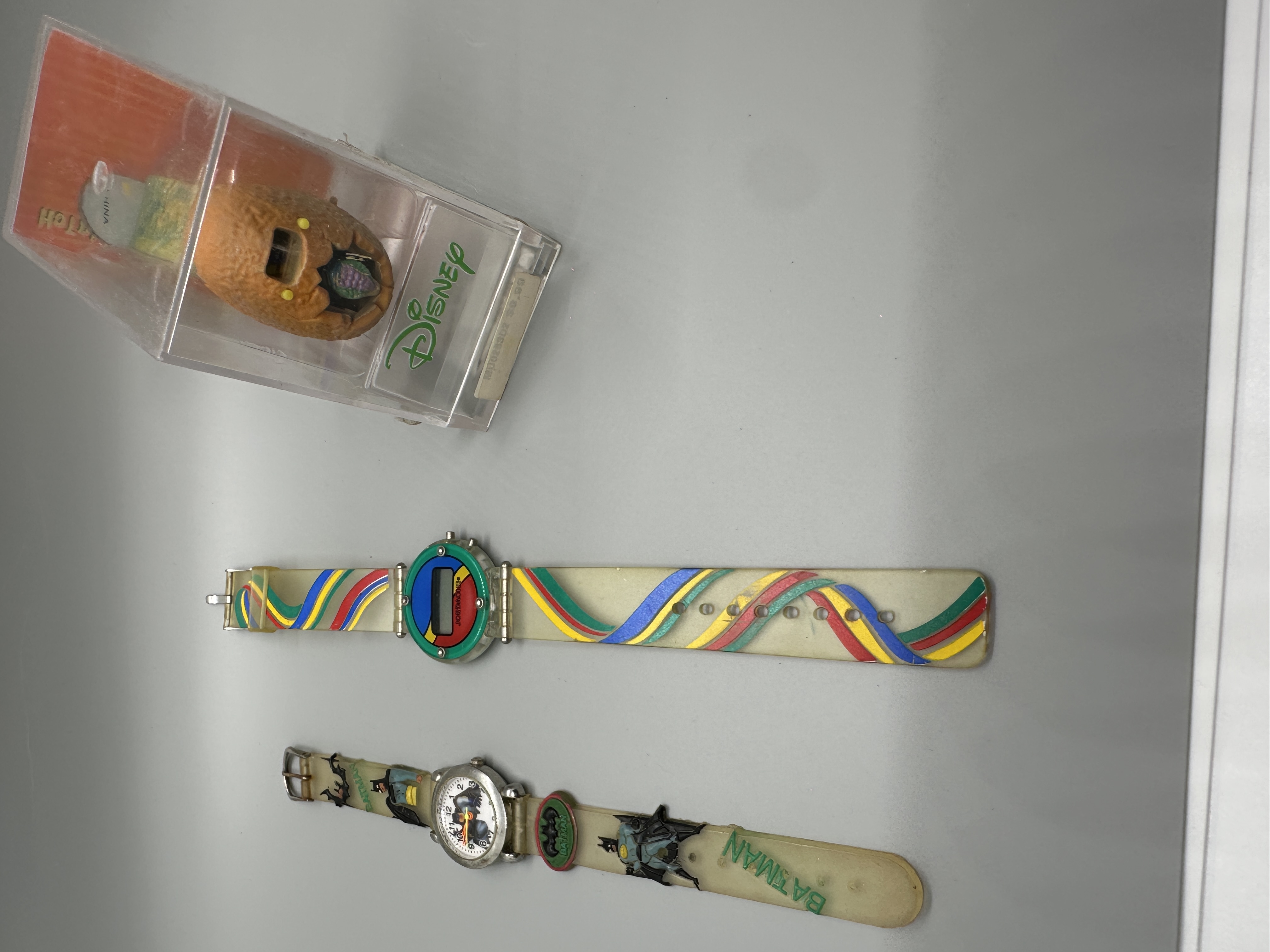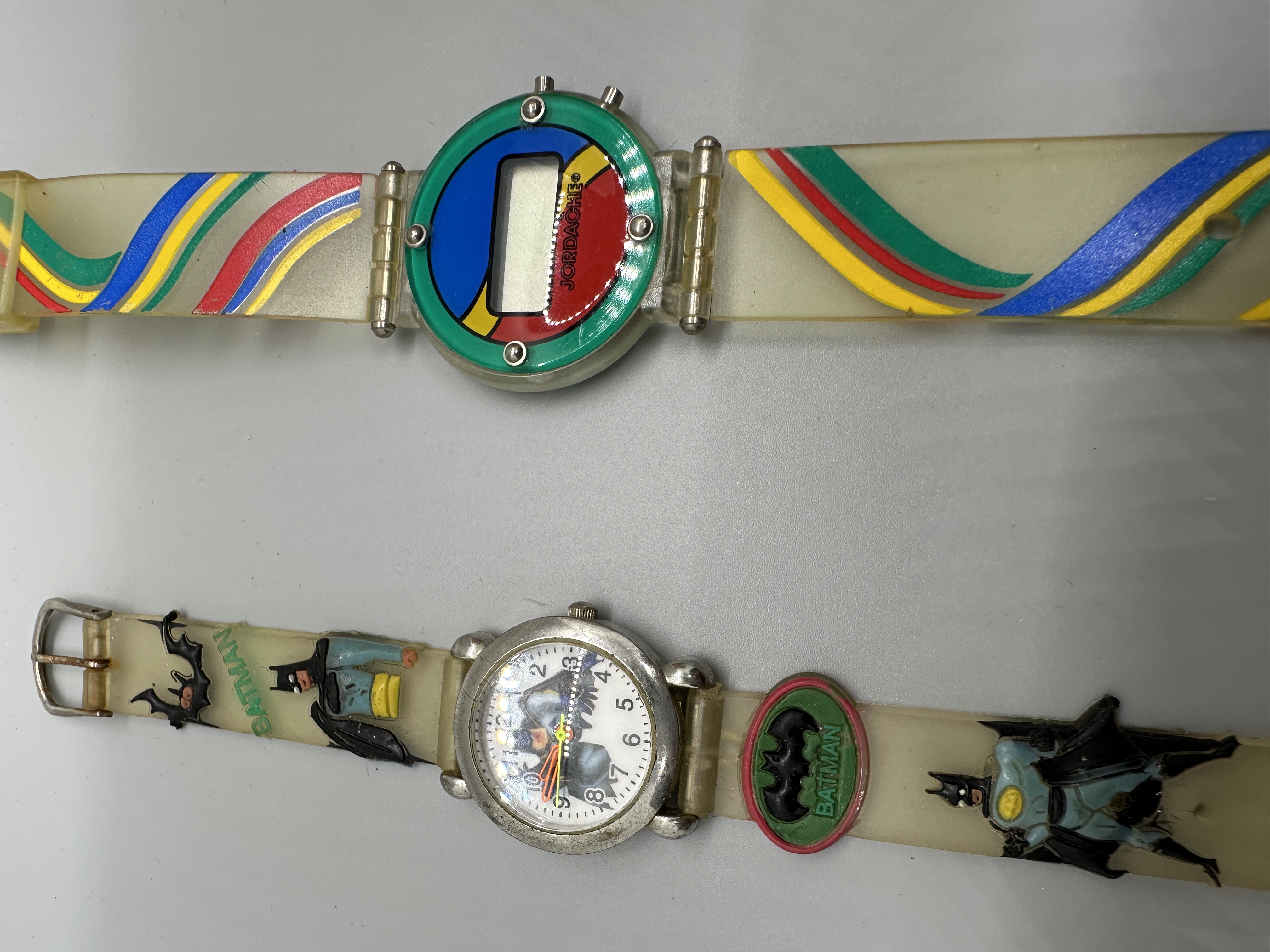 A trio of vintage wristwatches featuring a Jordache digital watch with a multi-colored striped clear strap, a Batman analog watch with a character-themed clear strap, and a boxed Disney dinosaur-themed digital watch.