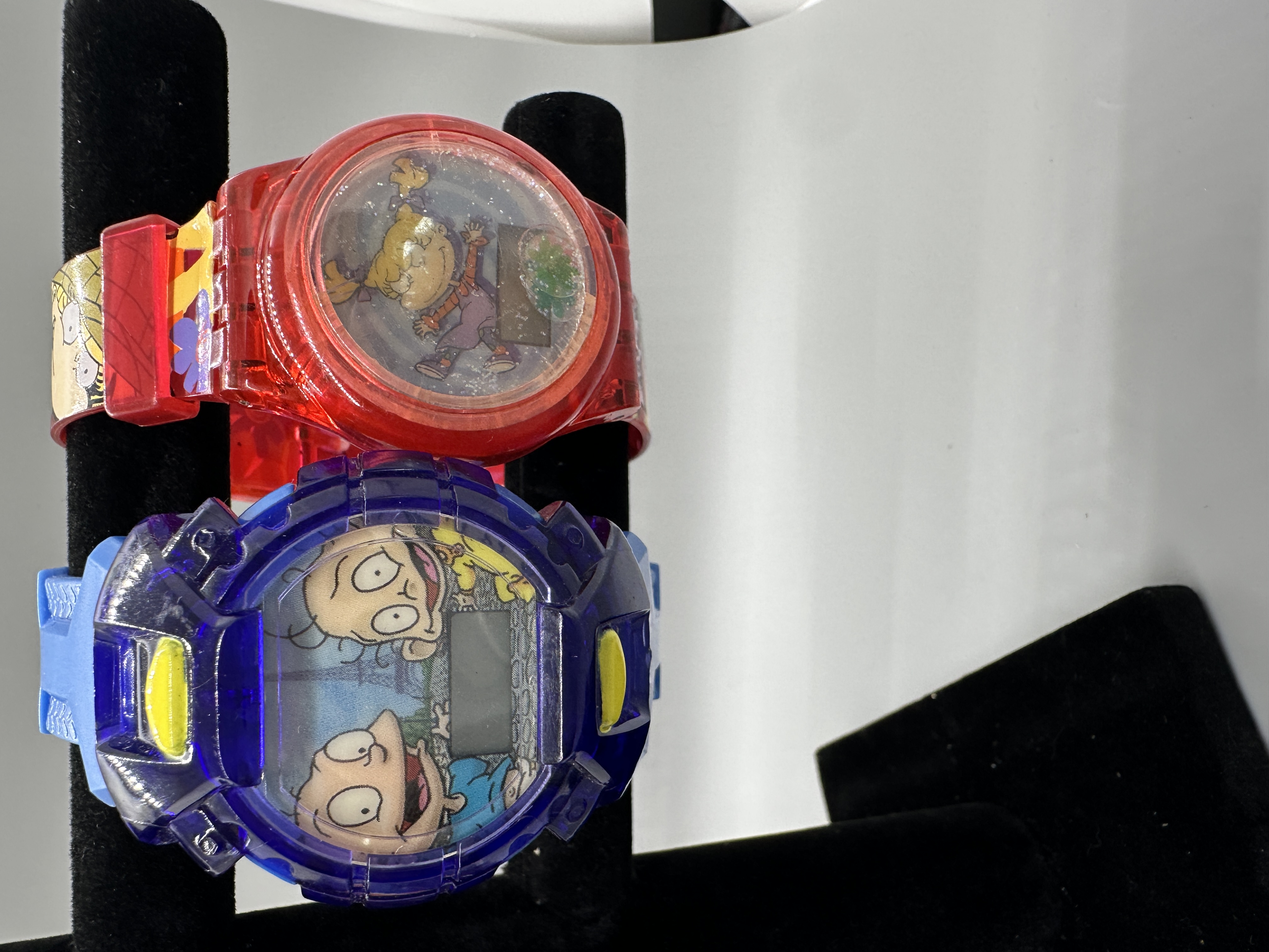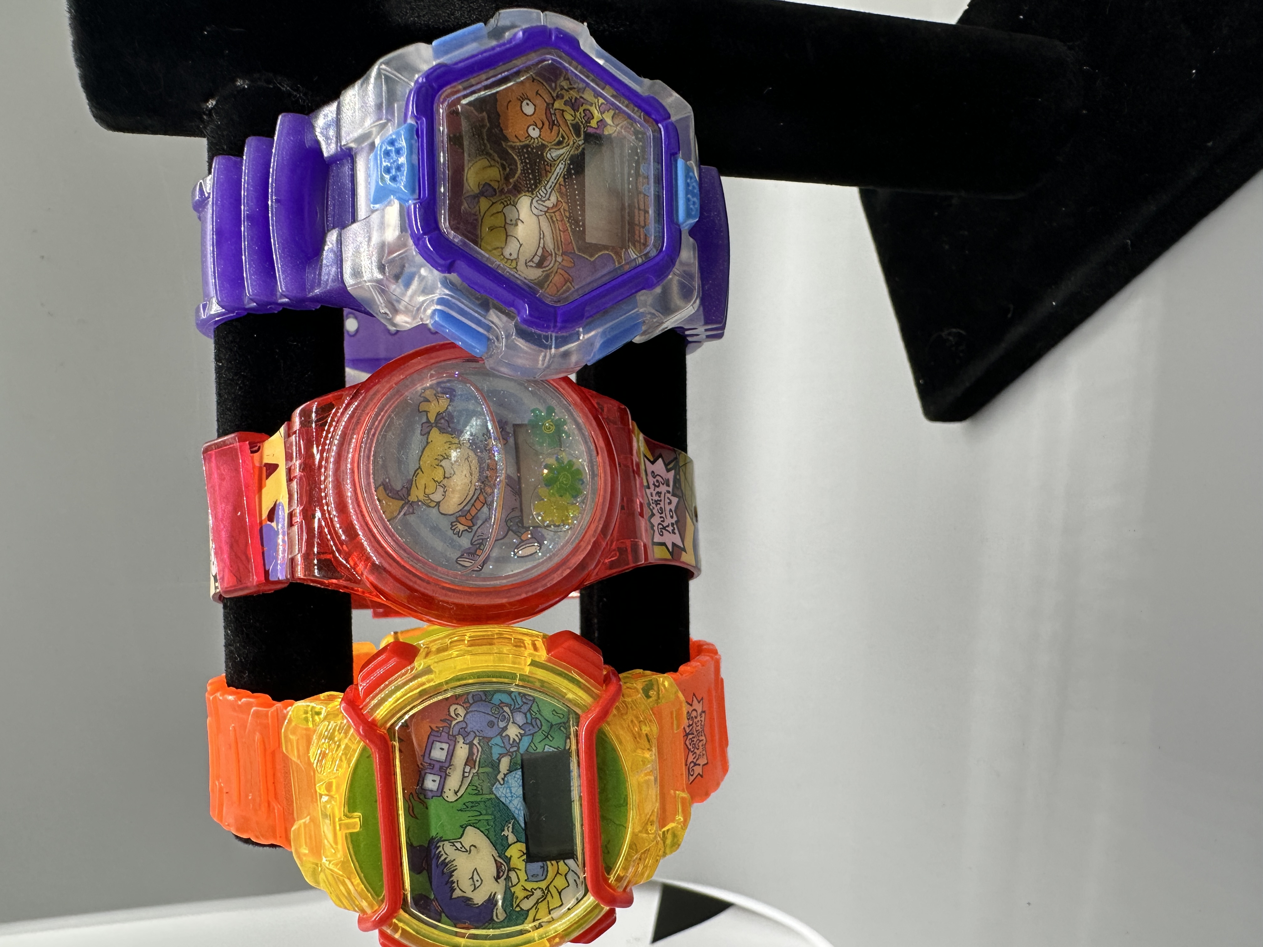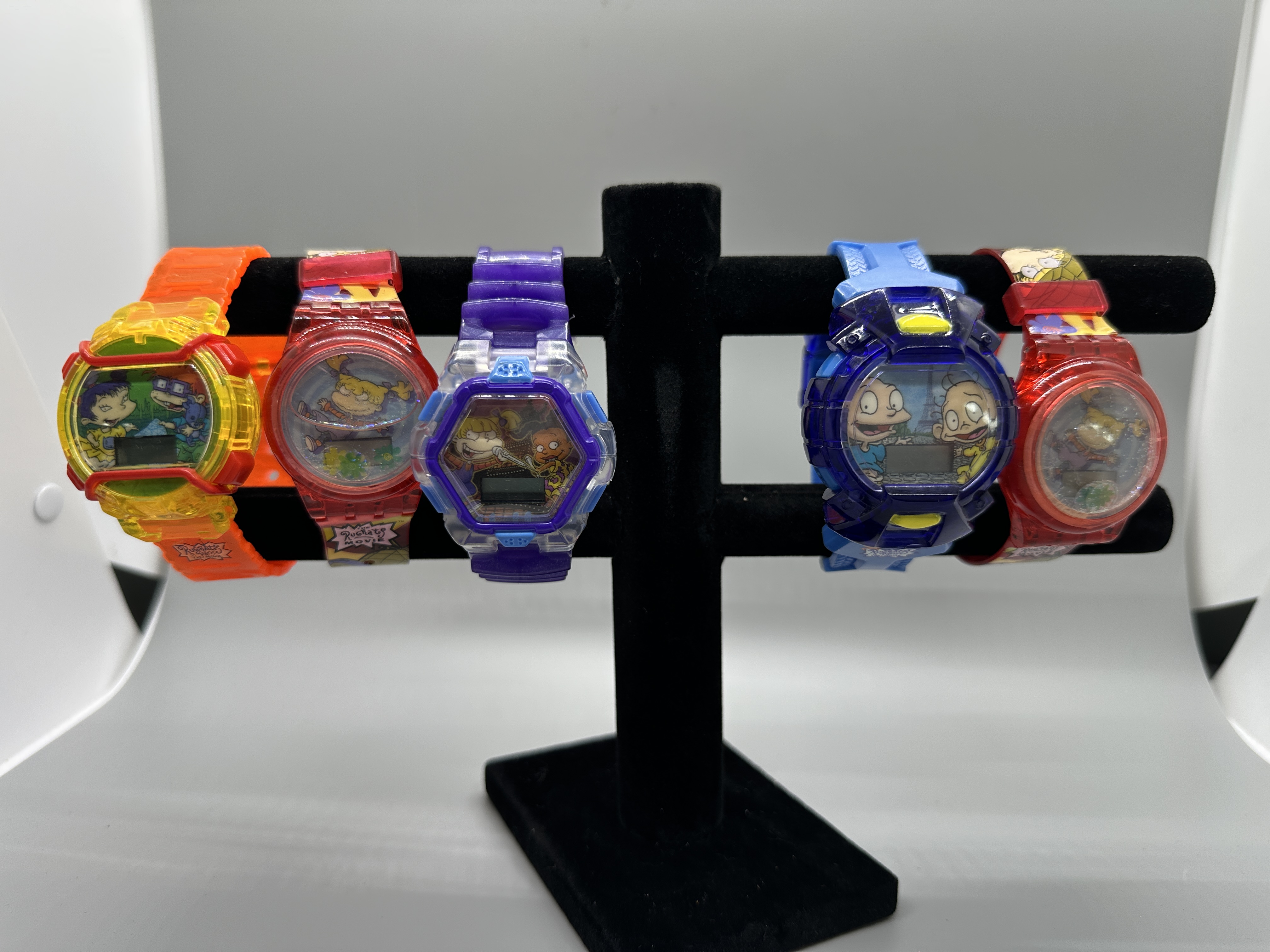 A collection of colorful plastic digital wristwatches in orange, red, purple, and blue featuring characters and logos from The Rugrats Movie.