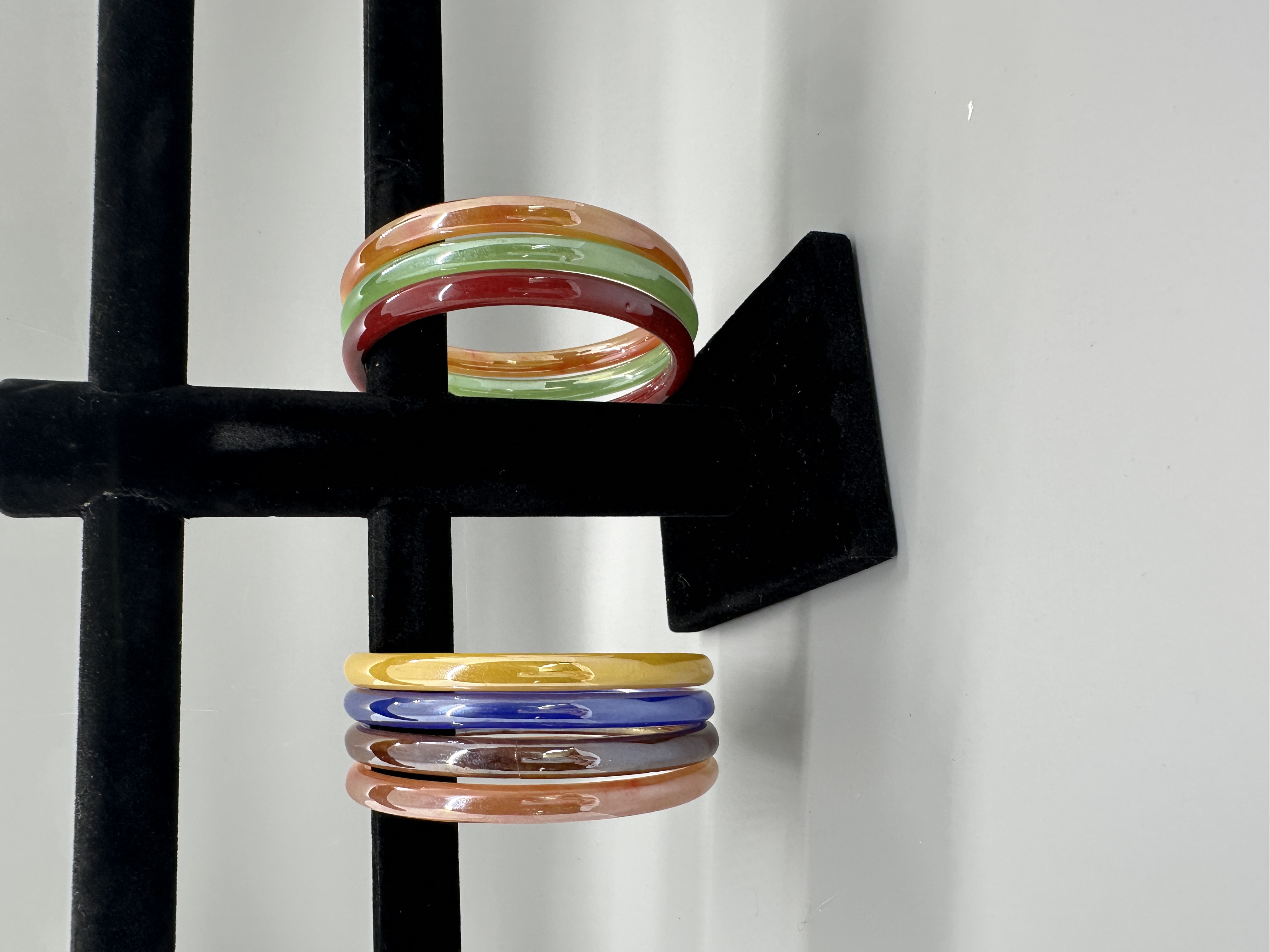 A collection of translucent and opaque glass bangle bracelets in various colors including orange, green, red, yellow, blue, and brown.