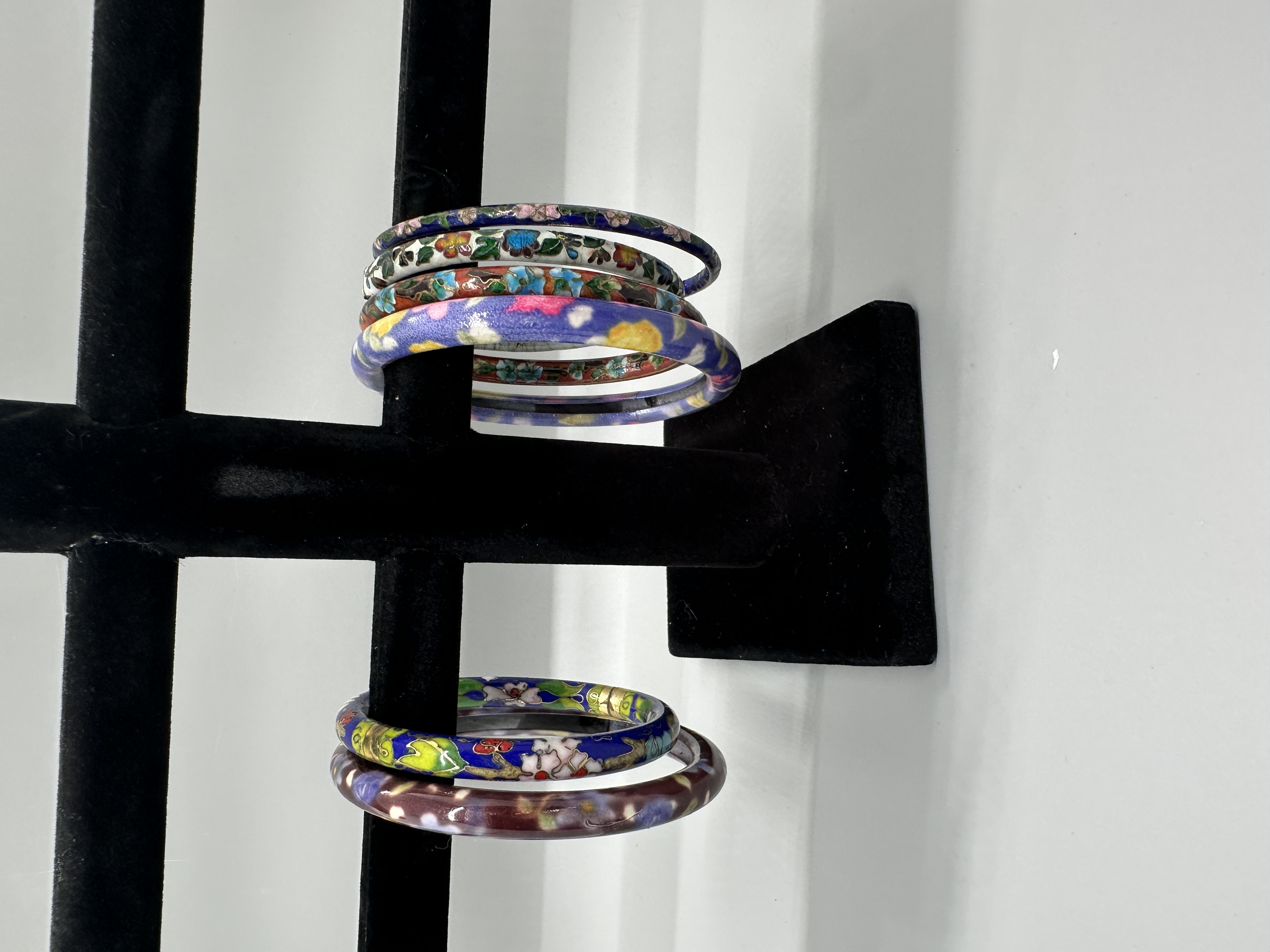 Several multicolored cloisonne style enamel bangle bracelets featuring various floral patterns