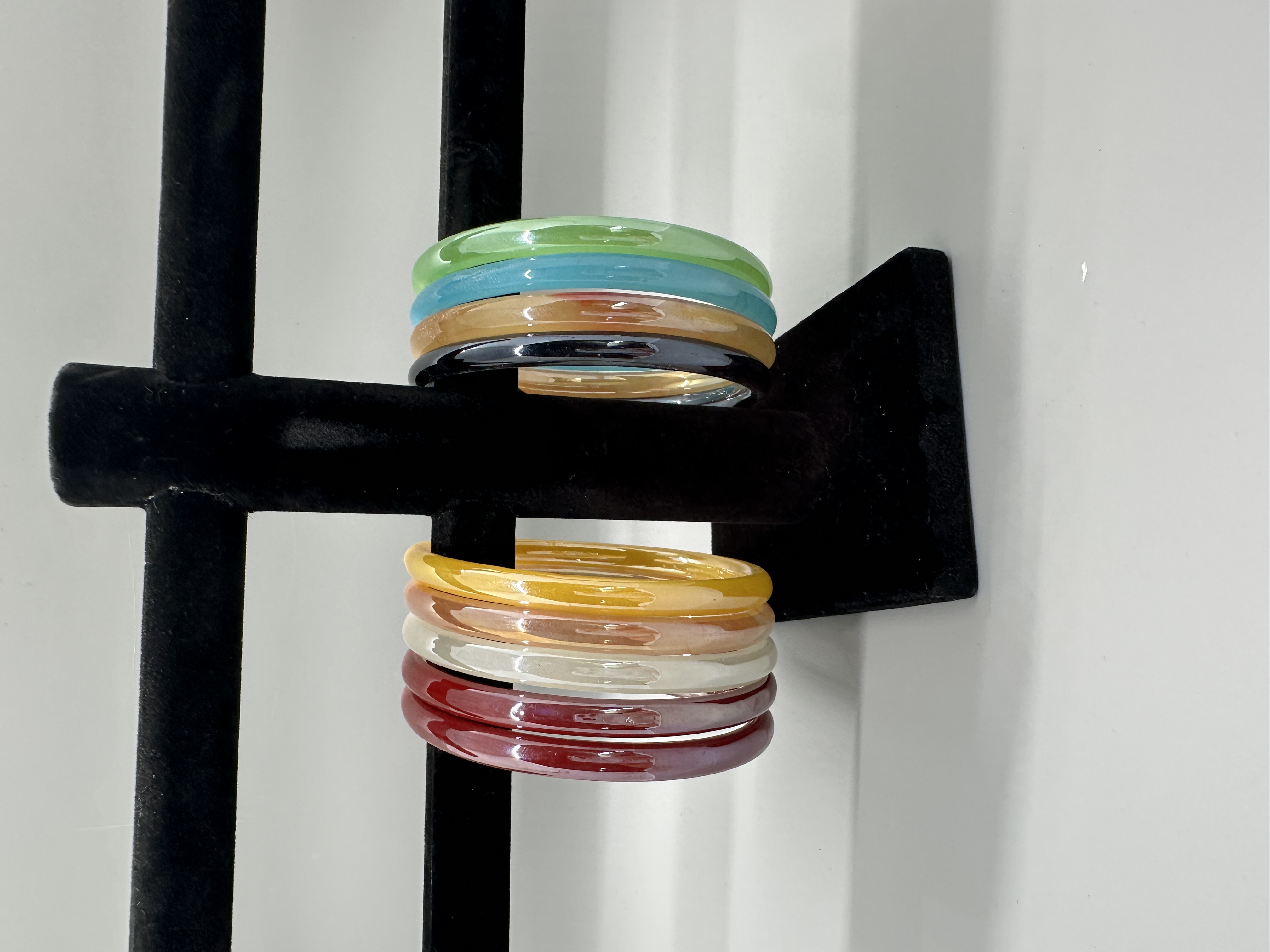 A collection of translucent glass bangle bracelets in various colors including green, blue, yellow, black, peach, cream, and red.