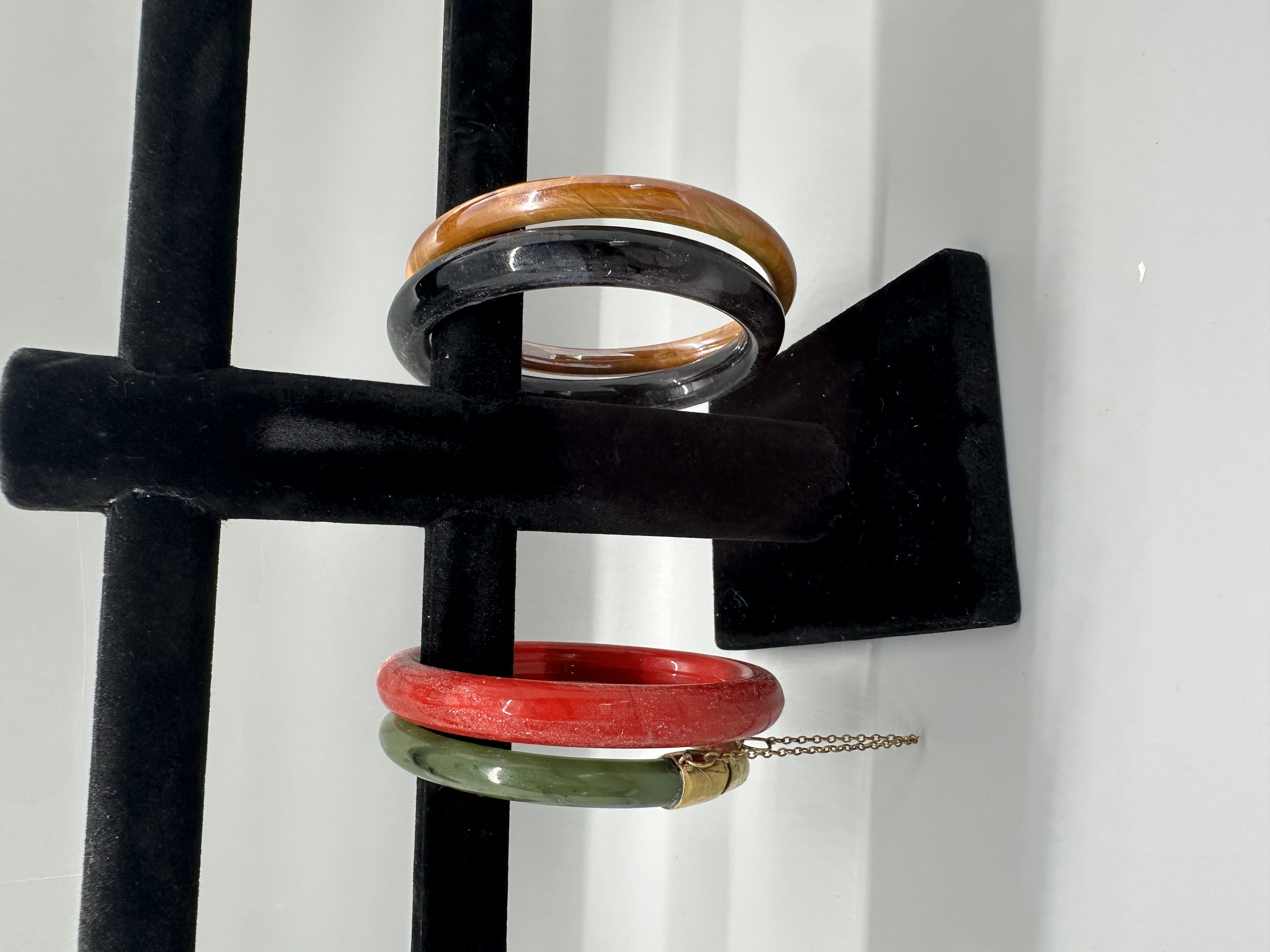 A collection of multiple bangle bracelets in shades of amber, black, red, and dark green, with the green bangle featuring a gold-toned clasp and safety chain.