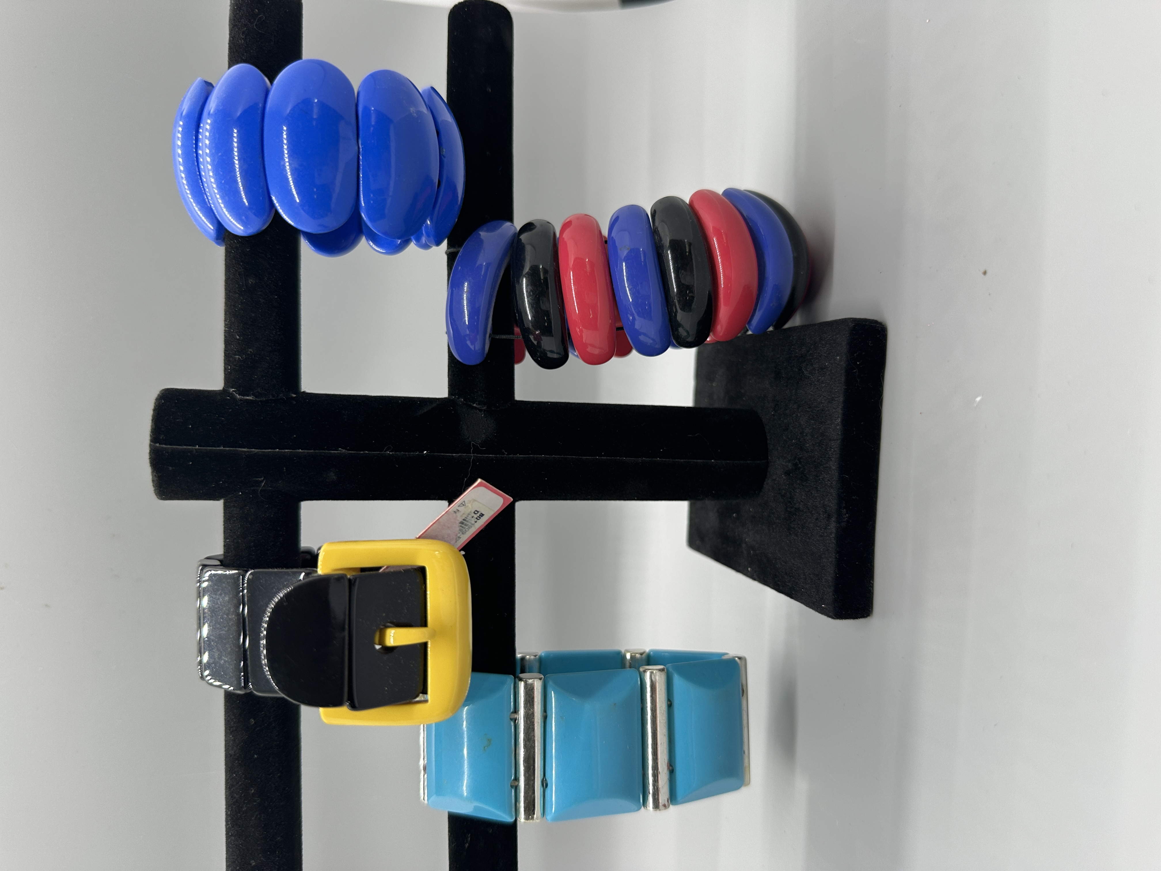 A collection of fashion bracelets in blue, black, red, yellow, and turquoise, including a buckle-style piece and a segmented turquoise design.