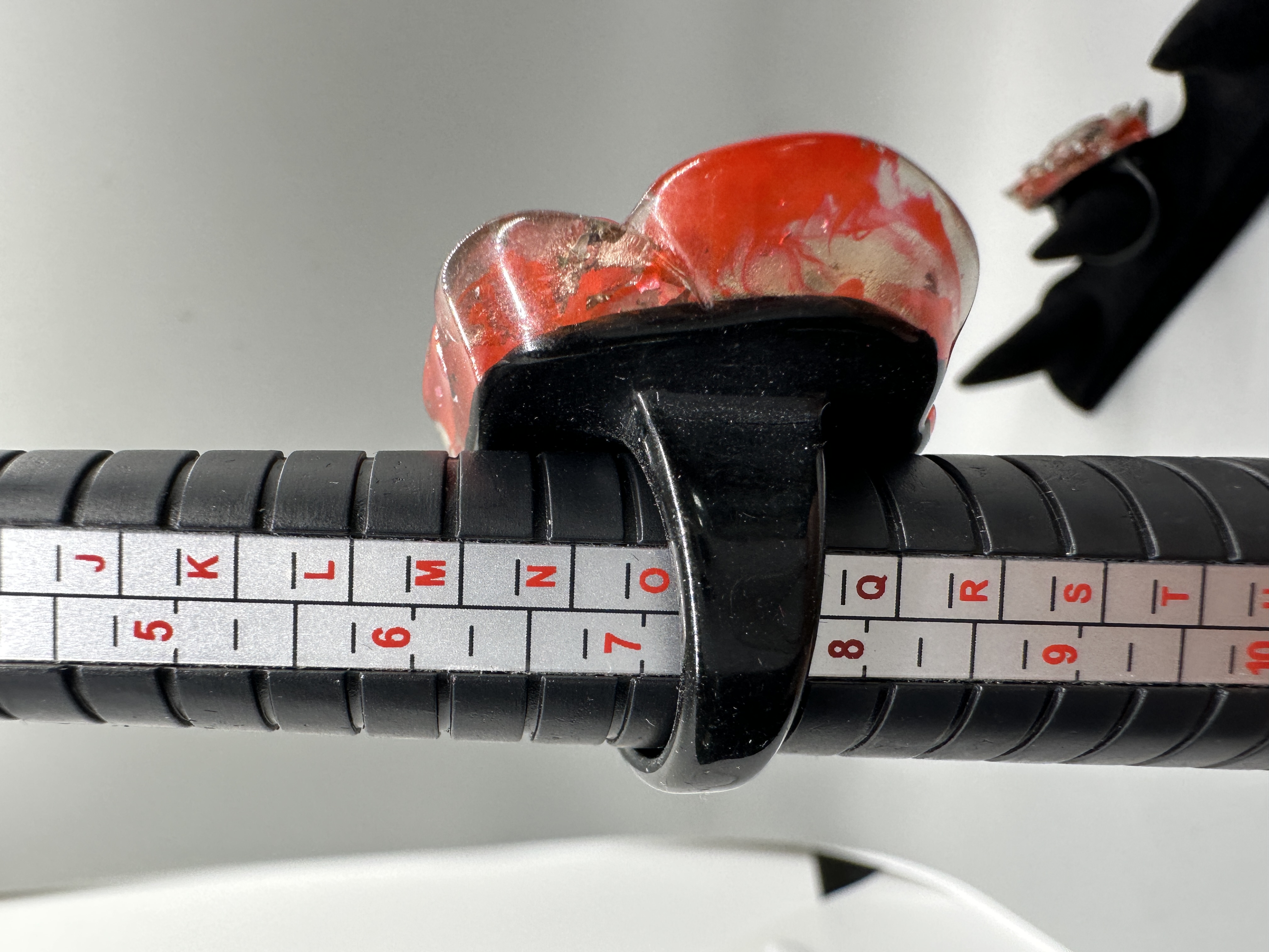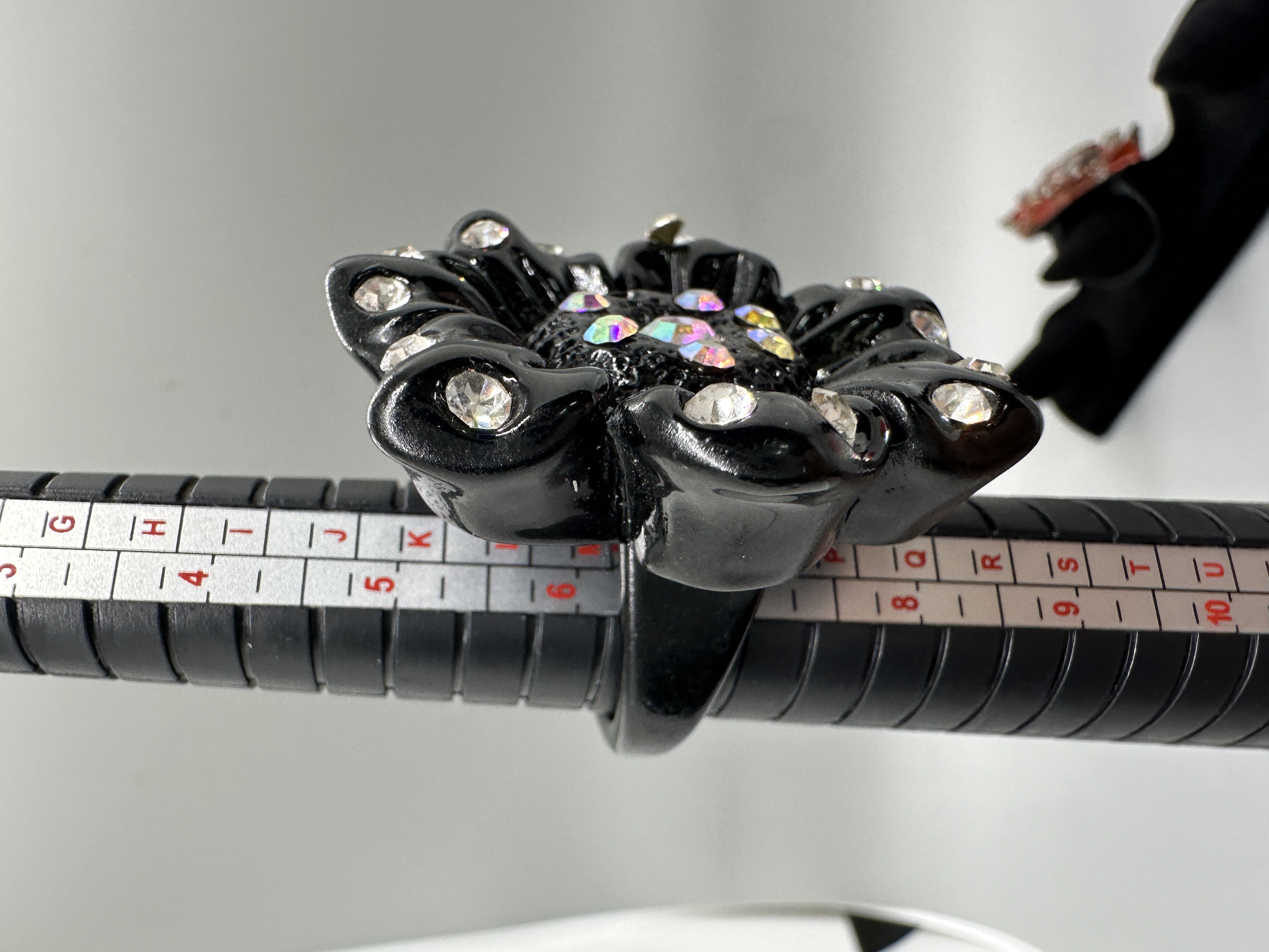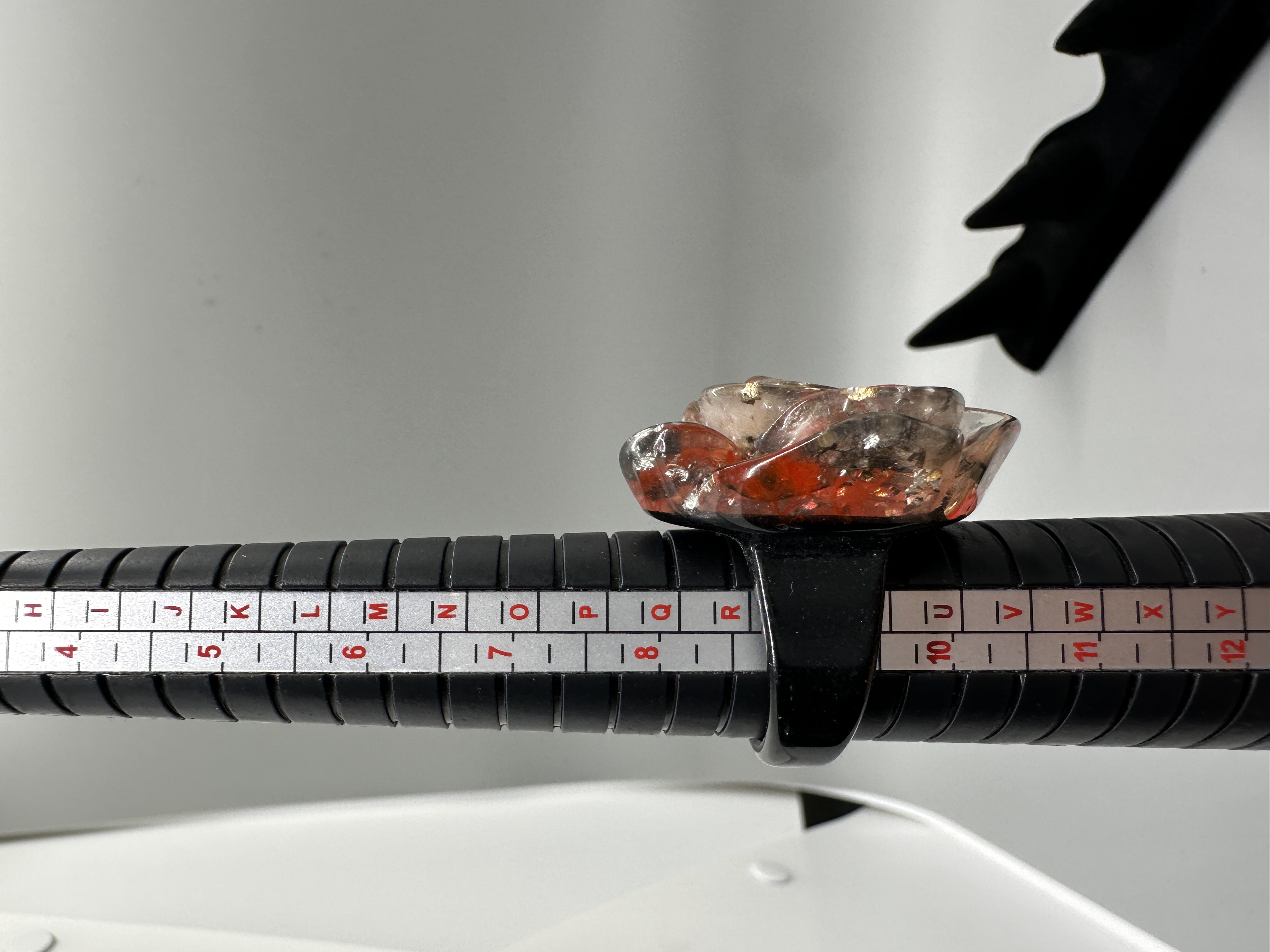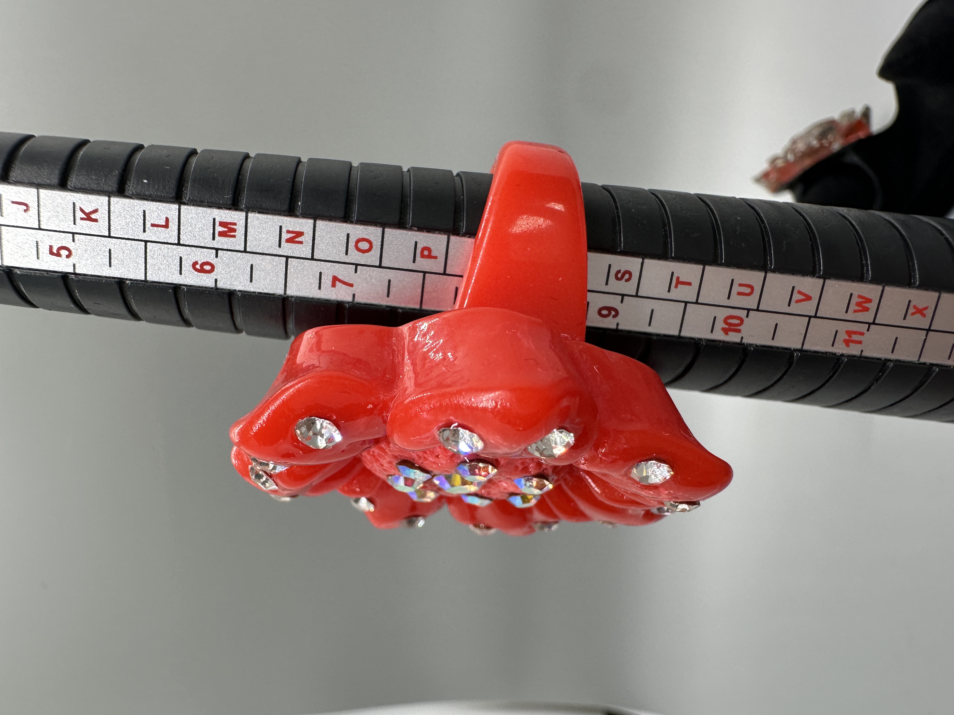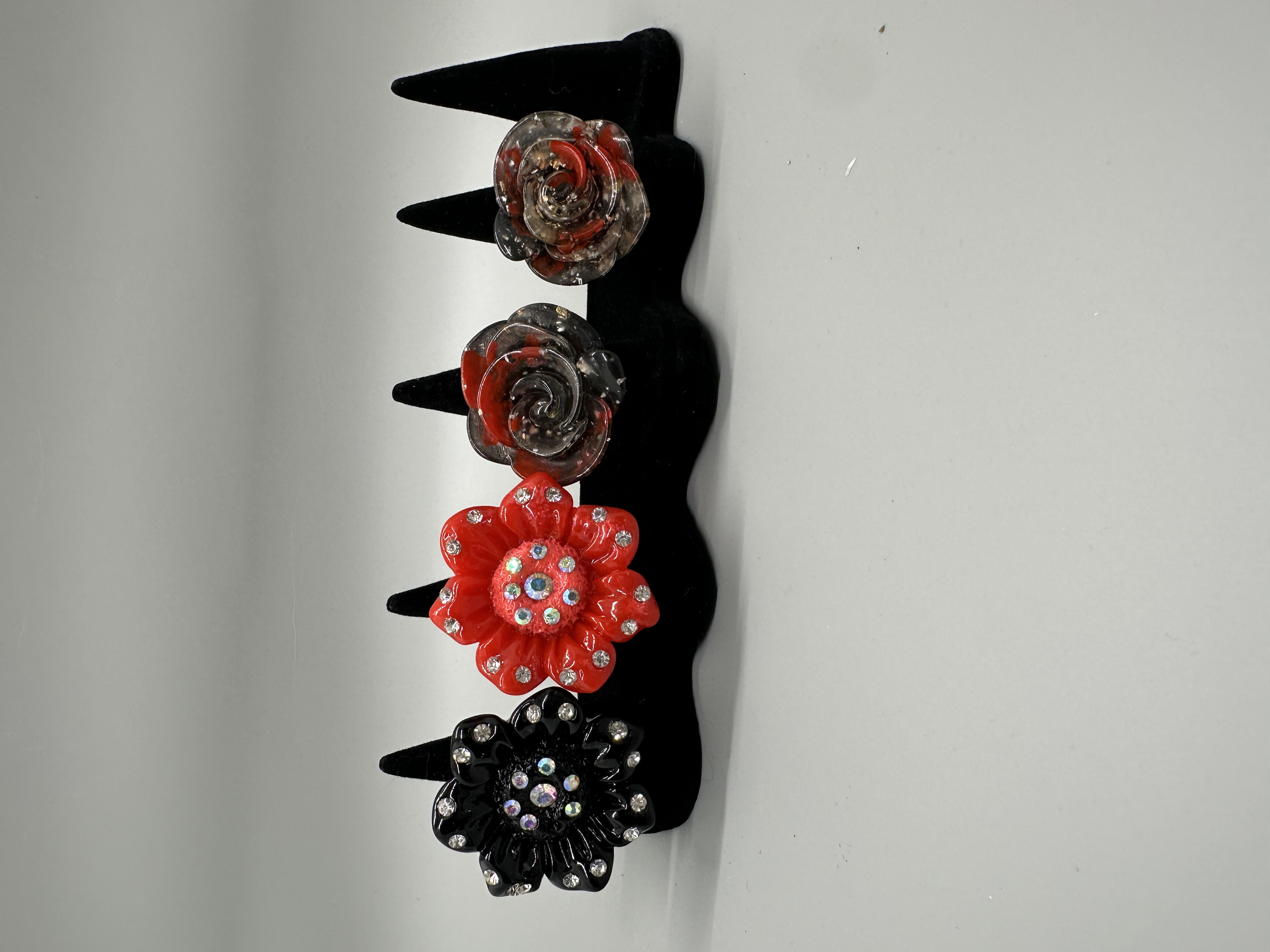 A collection of four plastic floral-themed rings in red, black, and marbled tones, two with rhinestone accents, ranging in size from approximately 7.5 to 8.5.