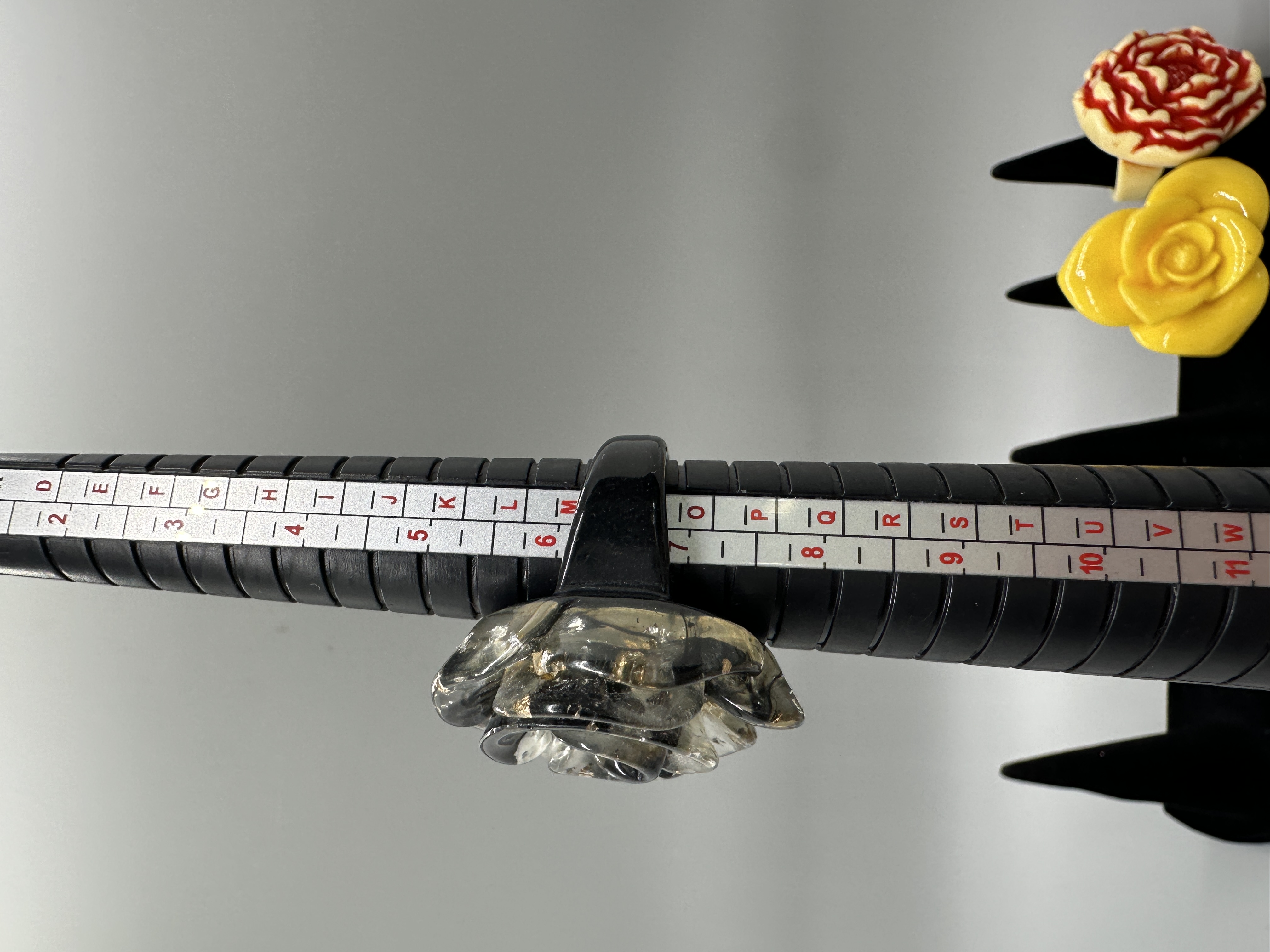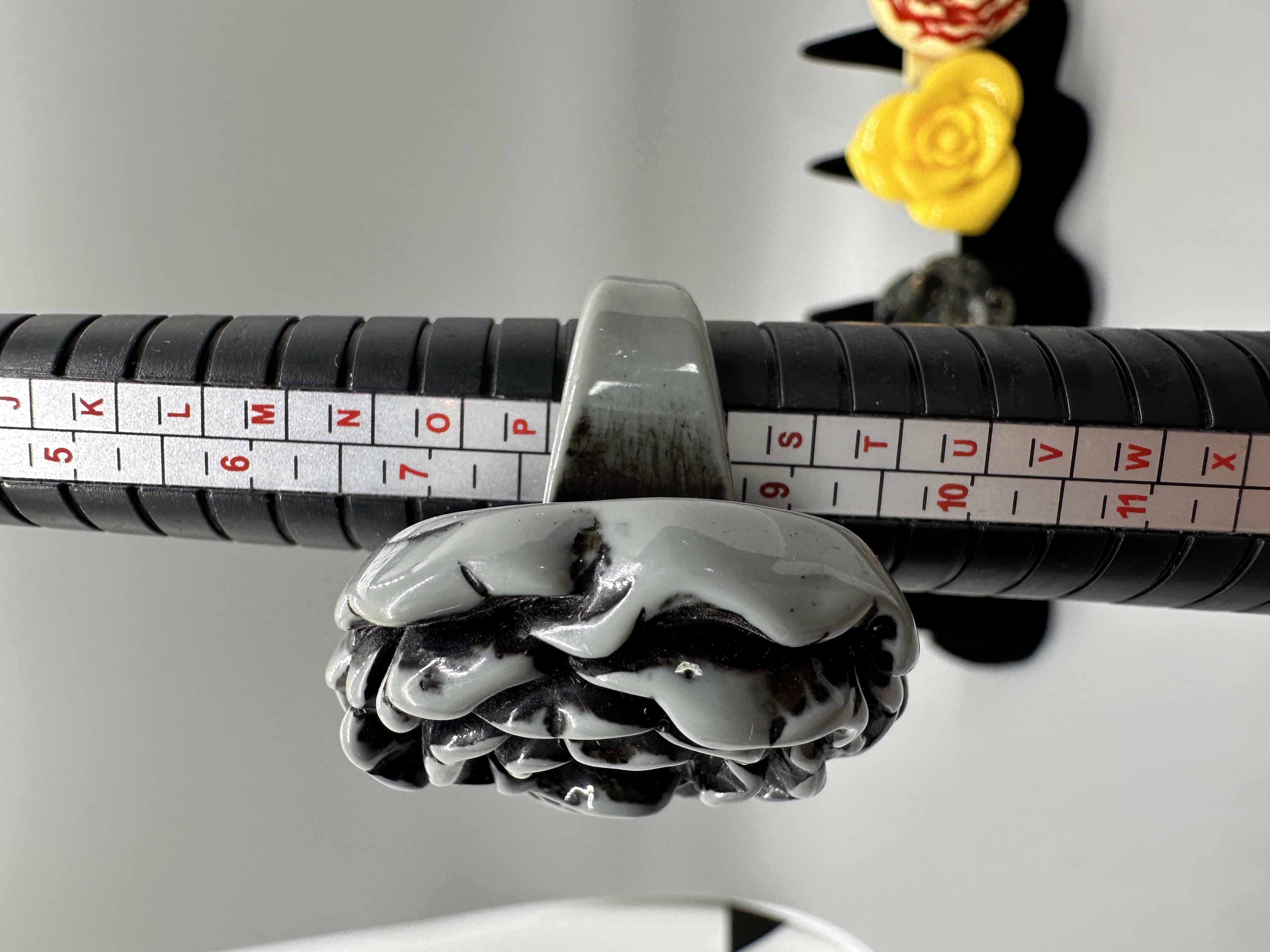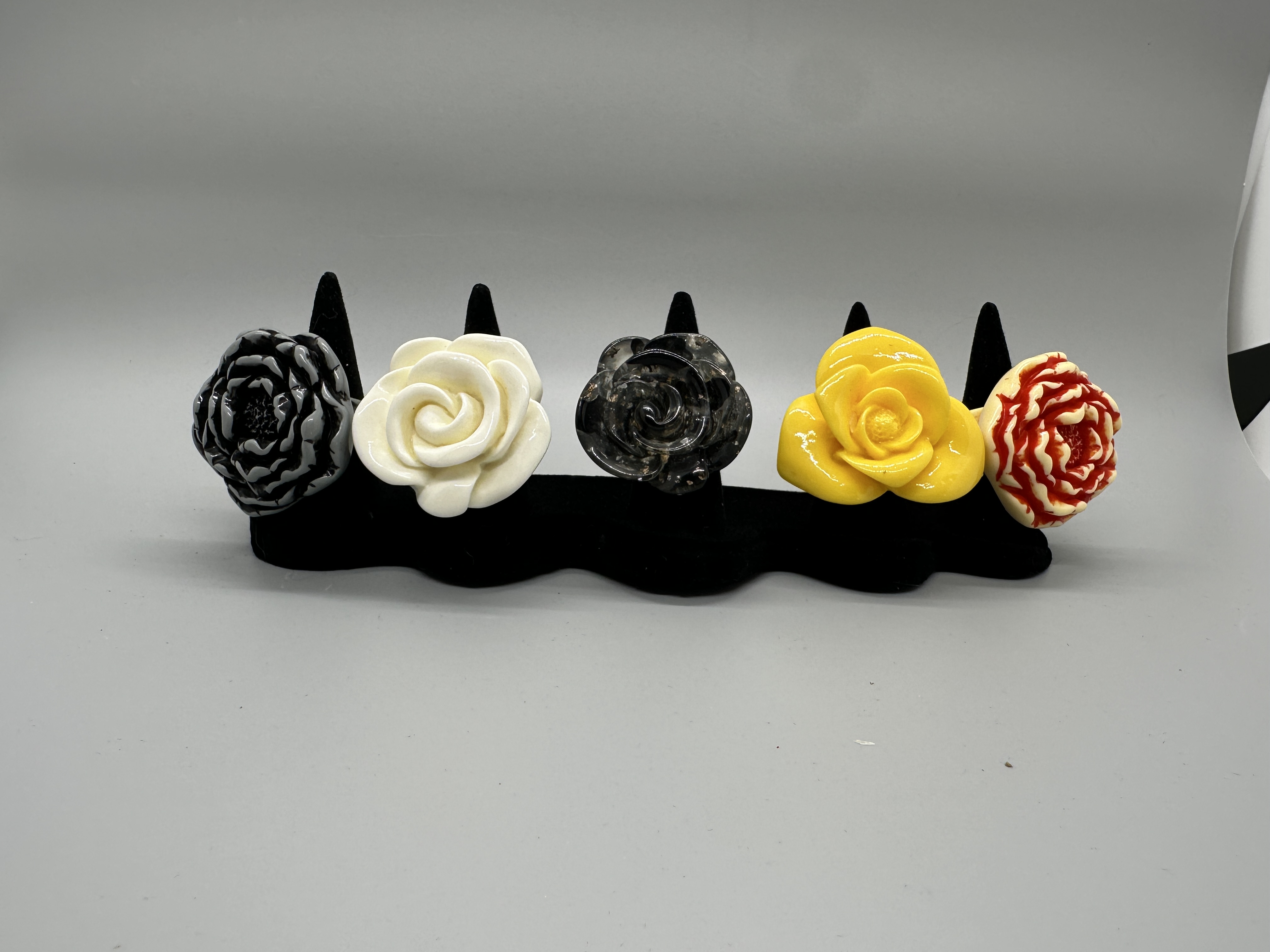 A collection of five resin rings in various floral shapes and colors including yellow, black, and white, with sizes ranging from approximately 7 to 8.5.