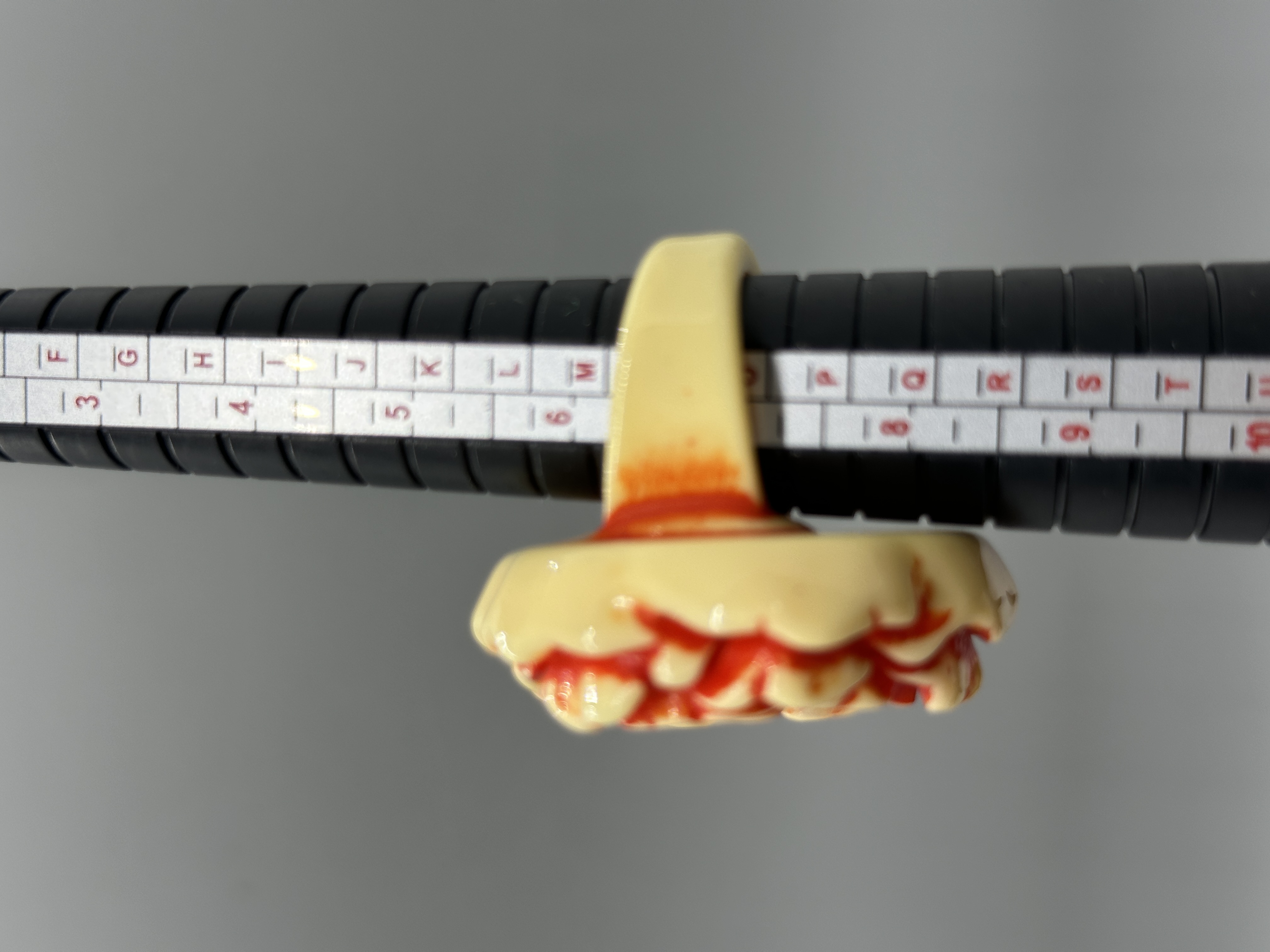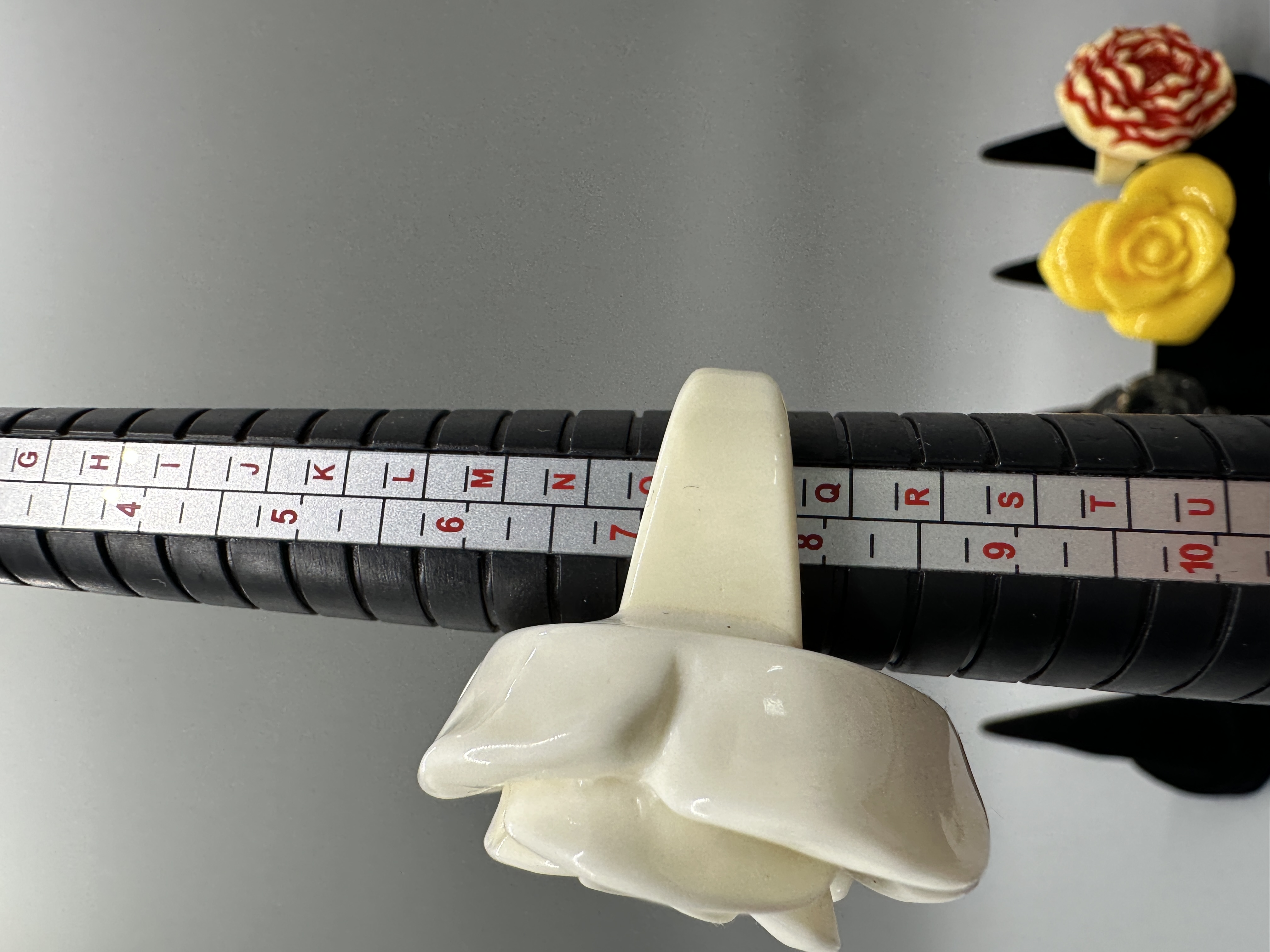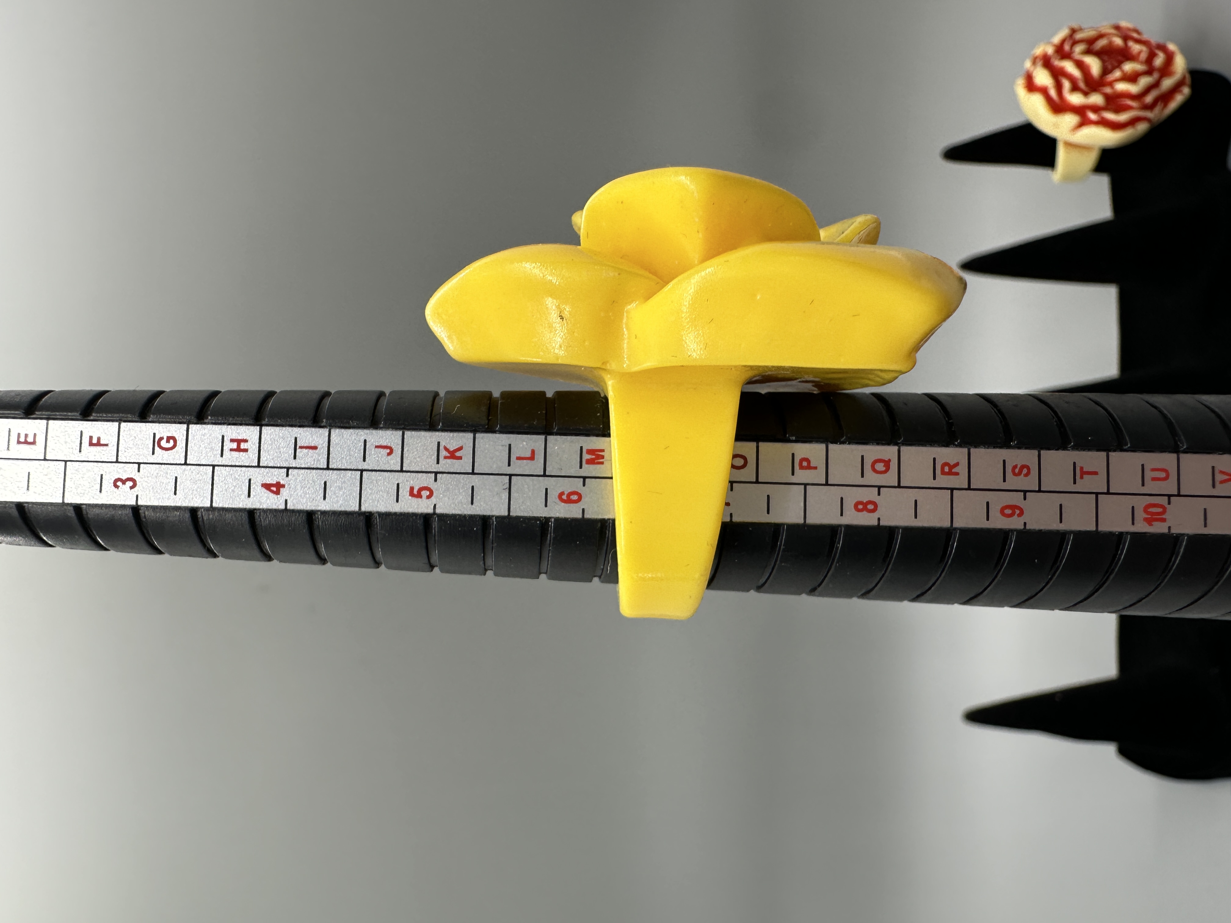 A collection of five resin rings in various floral shapes and colors including yellow, black, and white, with sizes ranging from approximately 7 to 8.5.