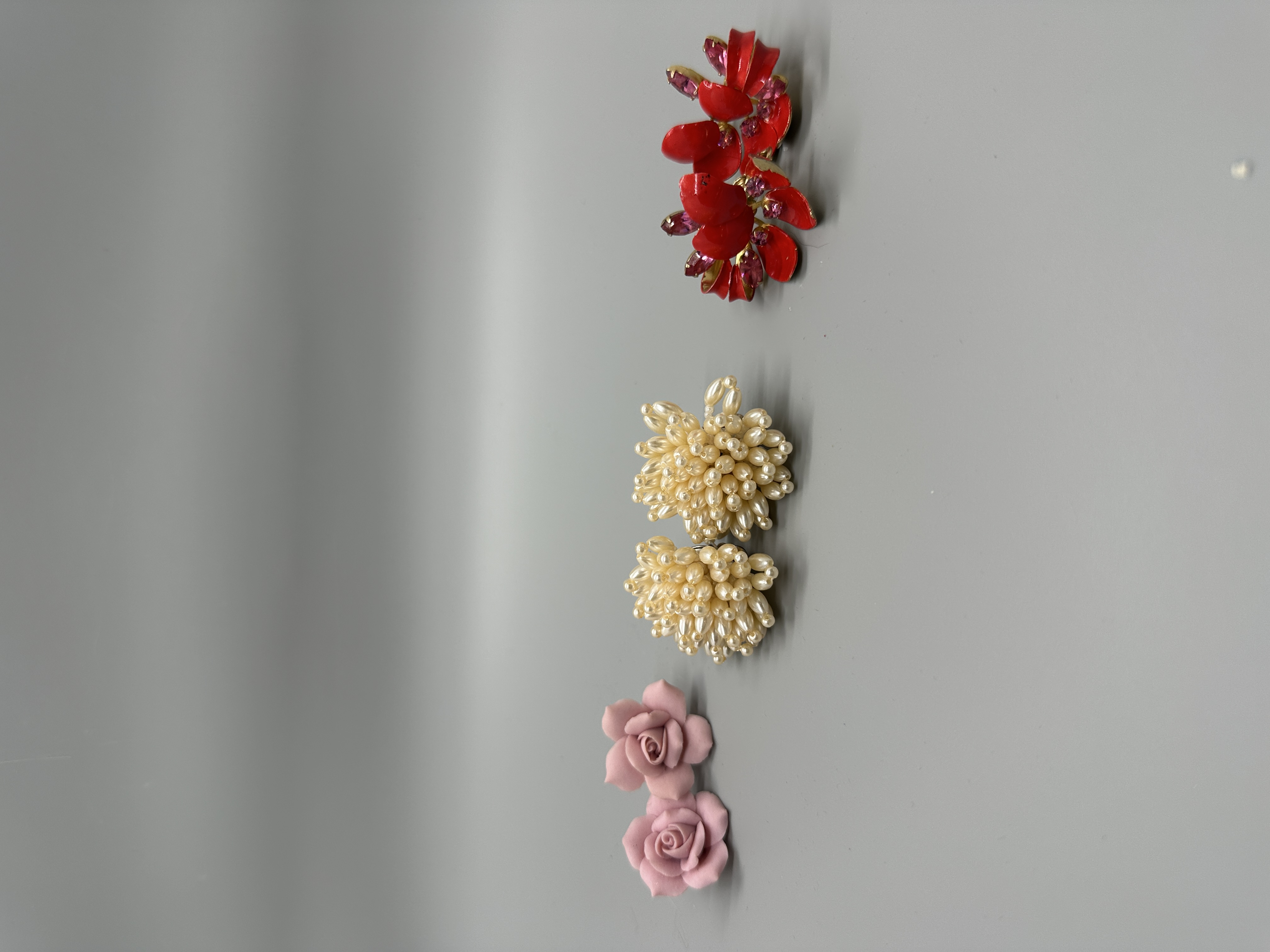A collection of earrings featuring red floral enamel with pink rhinestones, cream faux pearl clusters, and pink rose-shaped studs.