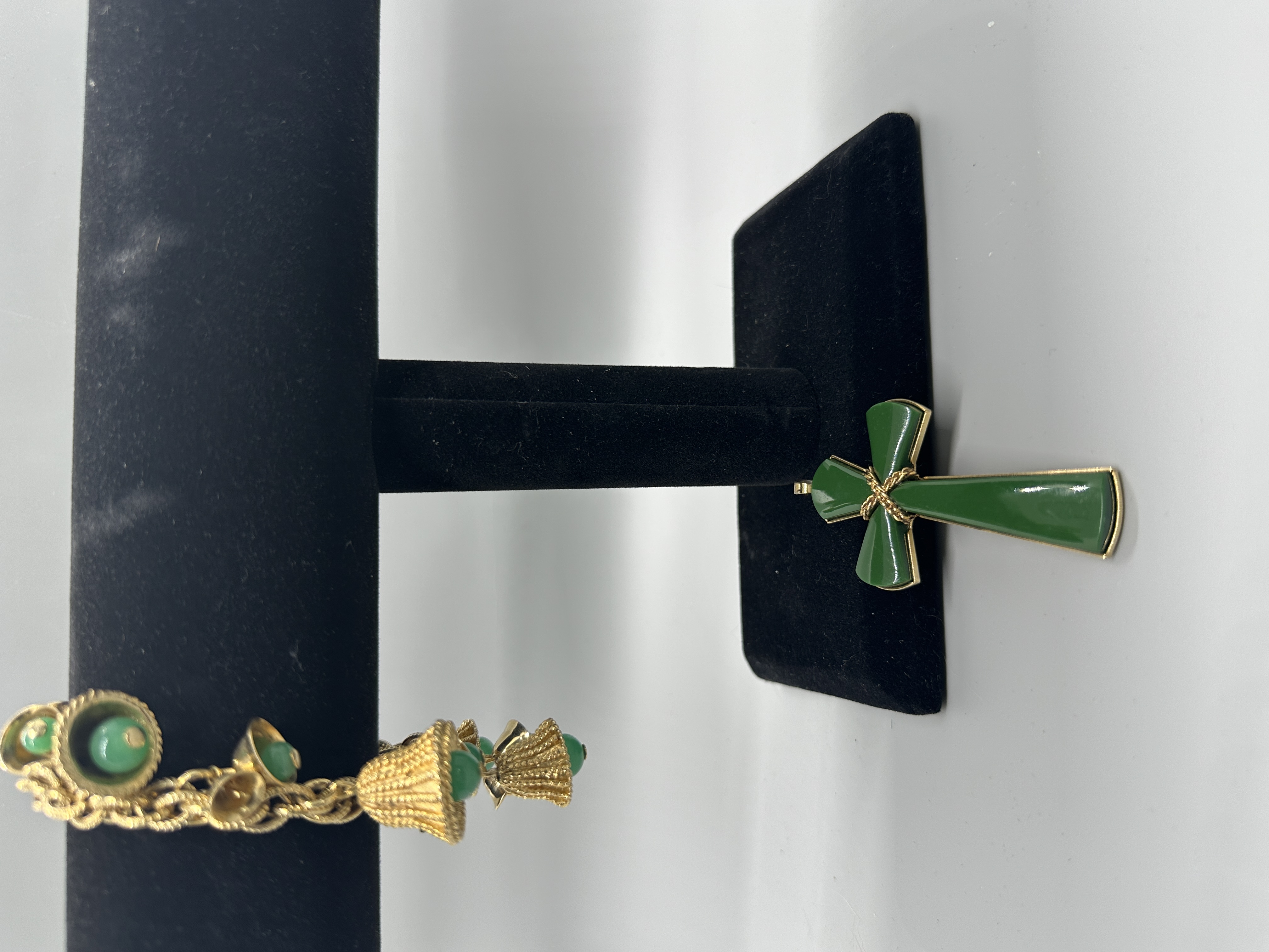 A collection of gold-tone jewelry featuring a charm bracelet with green beads and a green cross-shaped pendant with gold-tone wire accents.